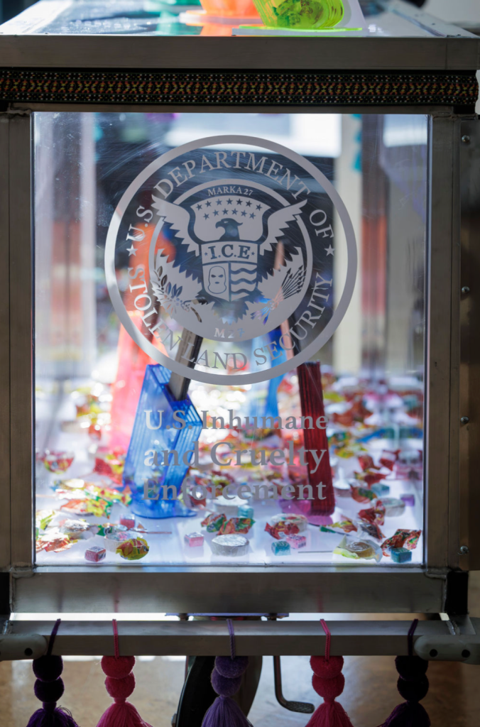 Melting neon paletas are reminiscent of the sticky melts that dripped down his young hands in the hot Texas summers as his family looked for work each day. The exhibit, charged with emotion and heartbreak, is a pointed attack on the Trump administration’s mass deportation efforts. Like the jokes on the sticks inside of real paletas, one of the sculpture popsicles is engraved with Quiñonez’s own version of the ICE insignia, reading “Inhumane and Cruelty Enforcement” in a seal bearing the words “Department of Stolen Land Security.”