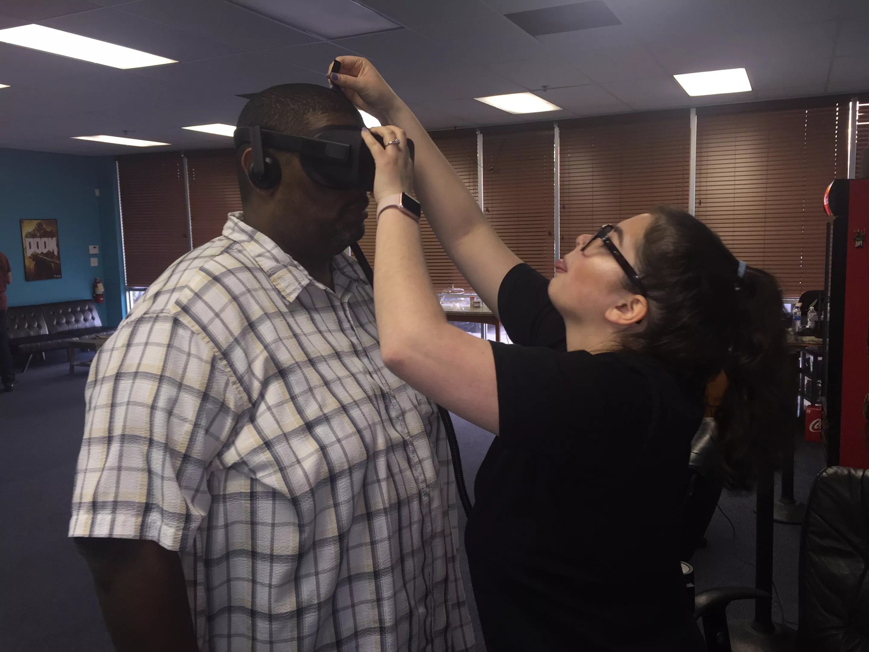 Gabby Nassans, the co-founder of ImaginationsVR, adjusts the virtual headset on Adrian Harry for a round of the Western horror shooter Dead and Buried.