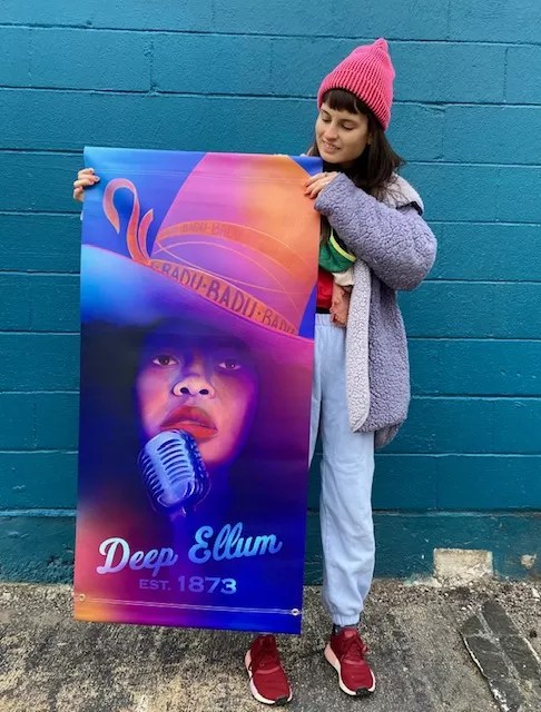 Artist Brooklynd Turner holding her banner of Erykah Badu for the Deep Roots project in Deep Ellum.