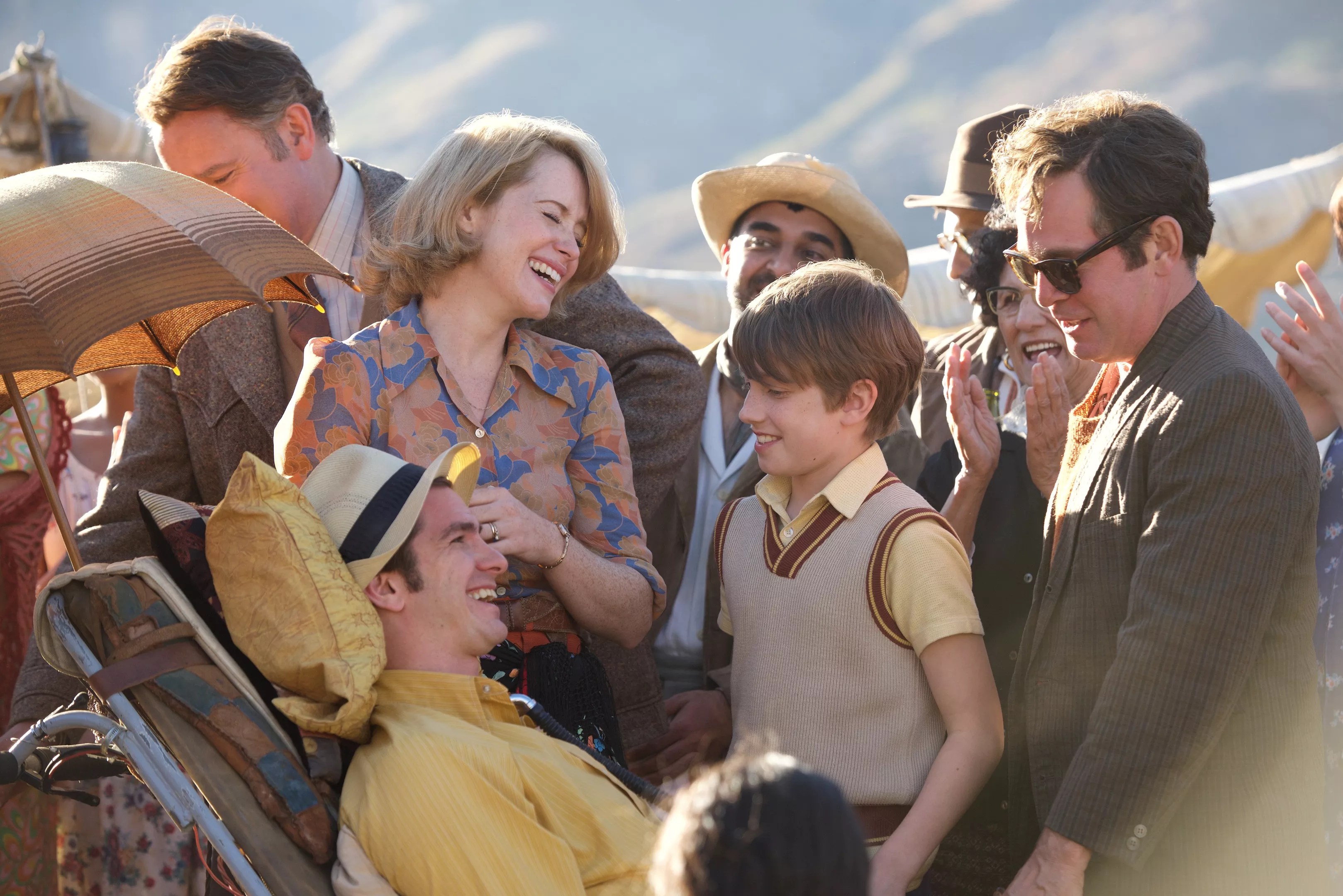 From there, though, this figgy pudding of a film mostly won me over. In the crumbling old estate that Diana has purchased, Robin and friends dream up innovations that would better the world, most notably a wheelchair with a ventilator in it. In Garfield, Serkis has found the rare leading man eager to smile freakily; in Serkis, Garfield has found the rare director eager to let him. The star has only his face and voice to work with, and it makes touching sense that, denied gestures, Robin would go big with his expressions. Hence Garfield’s horizon-wide grins, or his waggling his eyebrows like Groucho, as Robin is wheeled to garden parties or the mountains of Spain. Occasionally a crisis breaks out – the ventilator futzes out or the cord gets unplugged – but these instances lead to more breakthroughs or, in the most amusing case, the grandest party yet.