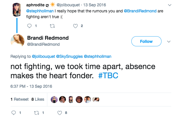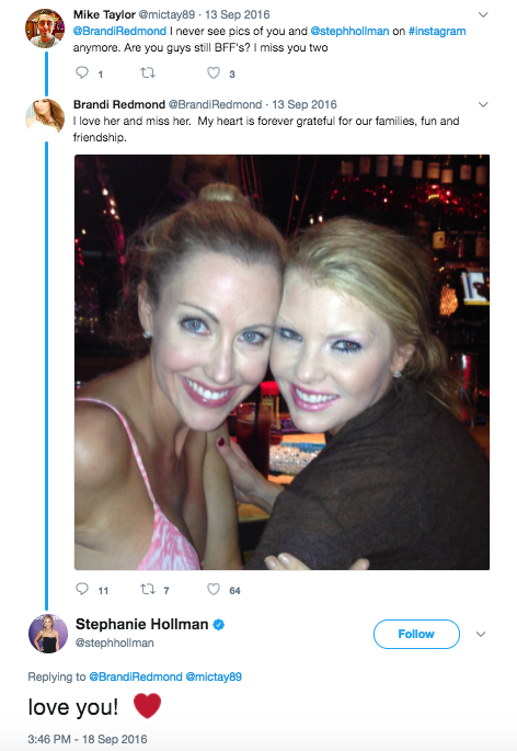 Redmond tweets a fan that she misses Hollman, who responds with “love you.”