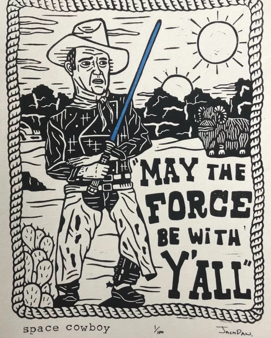 Passersby who encounter his work across the area can usually expect eccentric examples of Jackdaw’s folksy designs: Jesus blessing a Whataburger, a Jedi space cowboy, Ash Ketchum and Pikachu reimagined as Old Yeller. The black-and-white prints may not be the typical depiction of the Southern state, but Jackdaw believes each one is as uniquely Texan as he is.