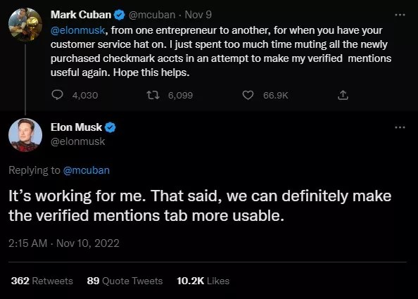 Most recently, Cuban called out Musk for ignoring Twitter’s biggest challenge to make “users feel safe” on the platform. Then he chastised Musk for not delivering a “Twitter Bill of Rights” because the platform has “no transparency.” That shut Musk up pretty good.