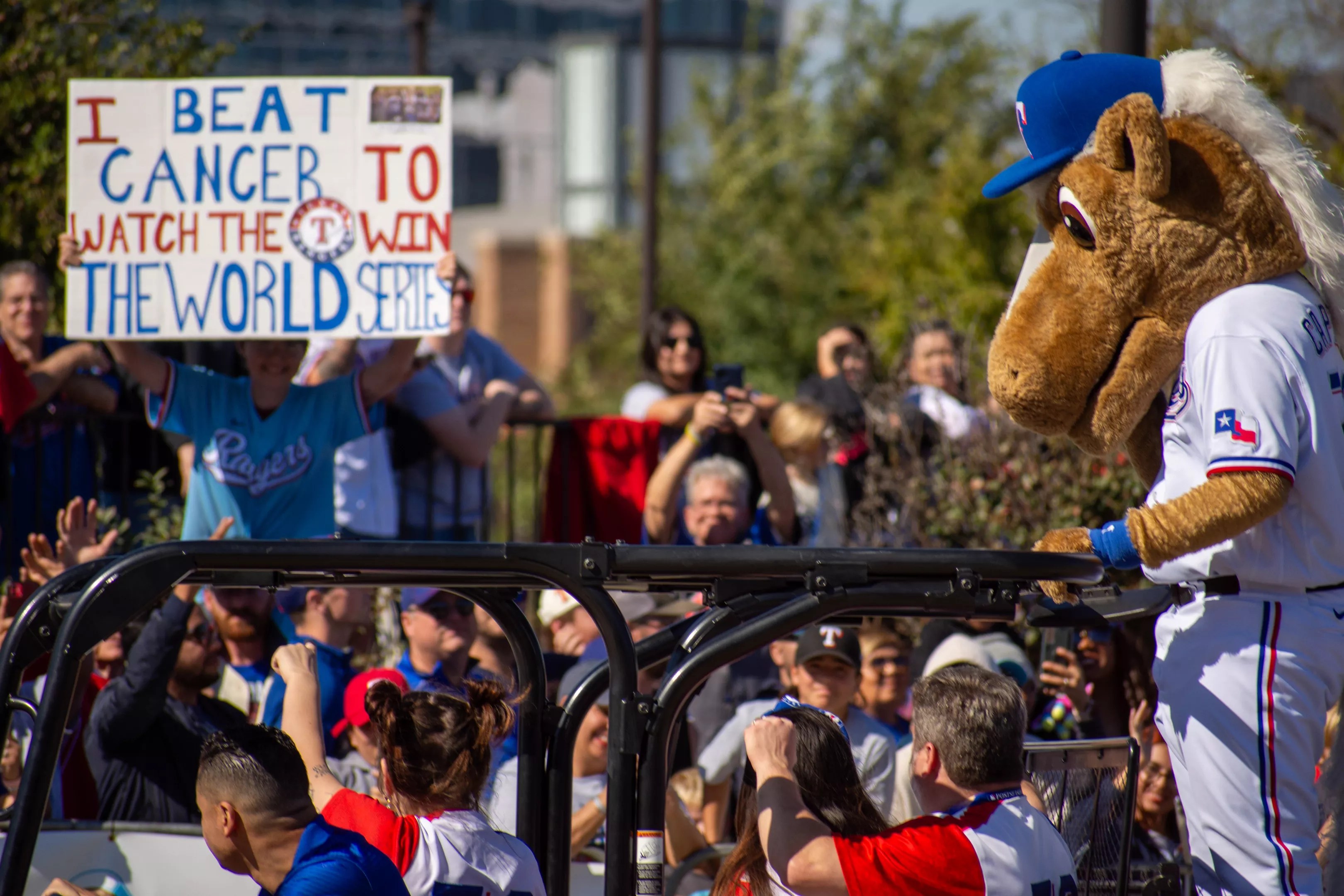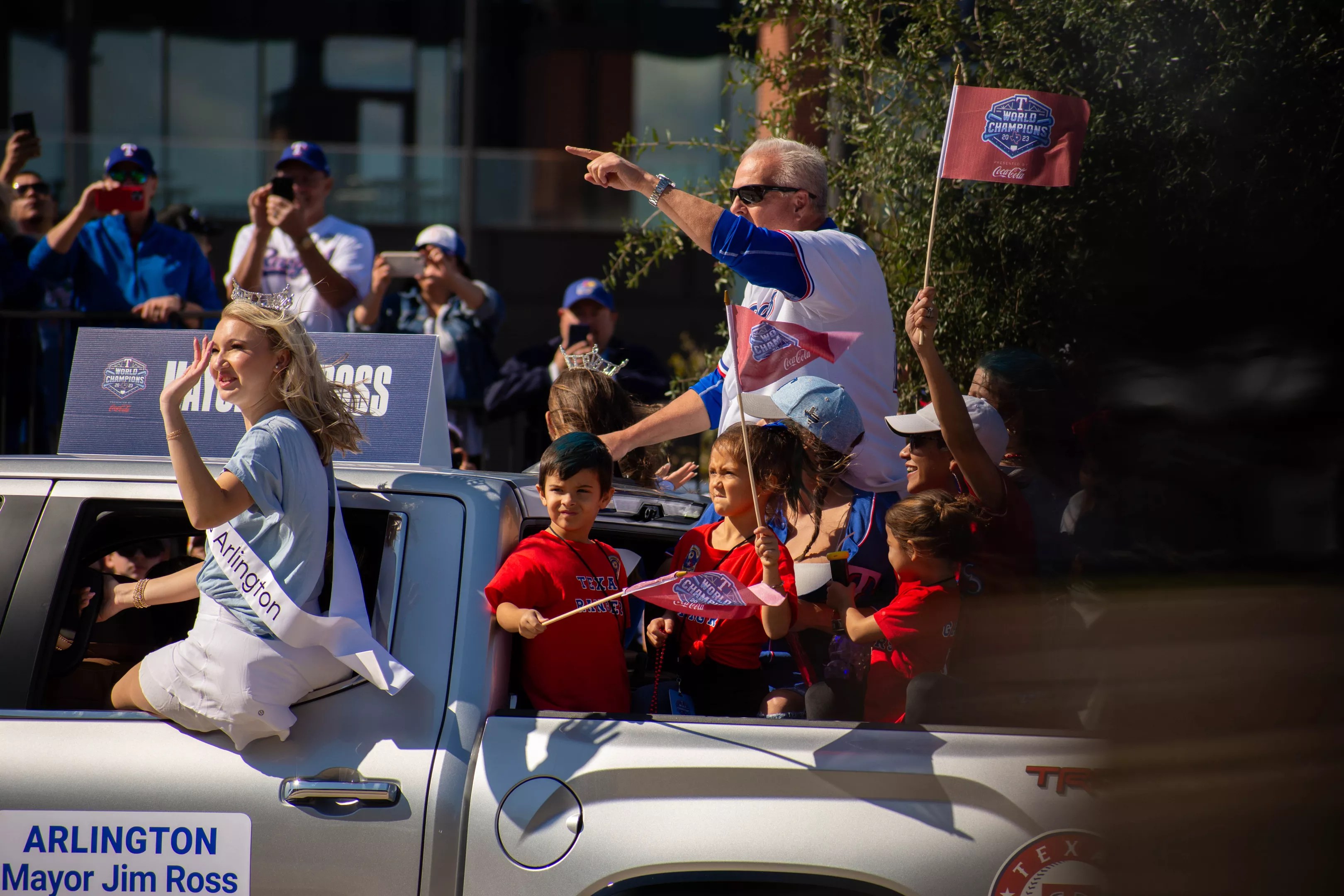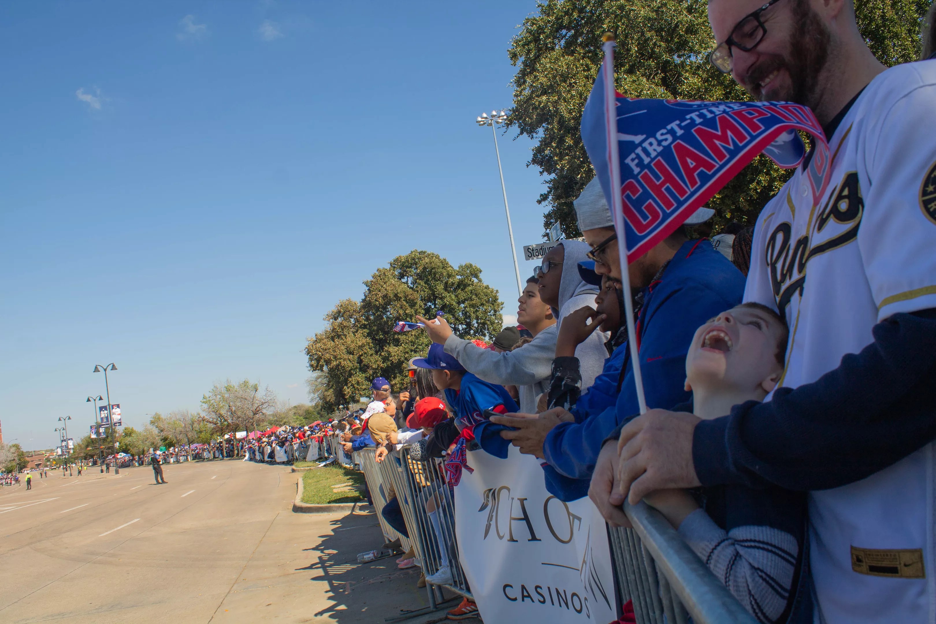 To celebrate of the Texas Rangers’ World Series victory on Wednesday, the city of Arlington threw a parade for fans on Friday. Schools closed, and hundreds of thousands of fans gathered in the streets to celebrate the team’s first-ever World Series title. The parade featured appearances by the Rangers themselves as well as various Arlington dignitaries and local high-school marching bands and cheerleaders.