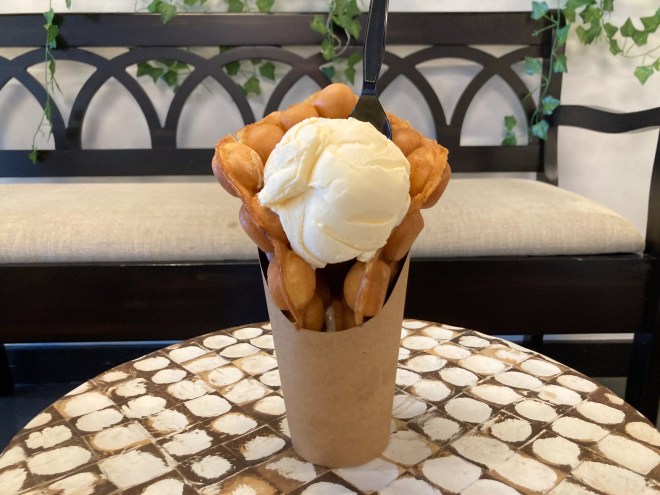 Gong Cha, a Taiwan-based spot known for its bubble tea, offers bubble waffles that are crispy on the outside and fluffy on the inside. They pair well with a scoop of ice cream.