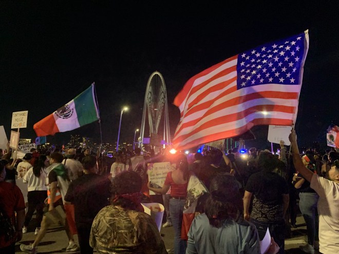 At least one arrest was made at the largely peaceful protest, attended by hundreds at the Margaret Hunt Hill Bridge, which DPD blocked.