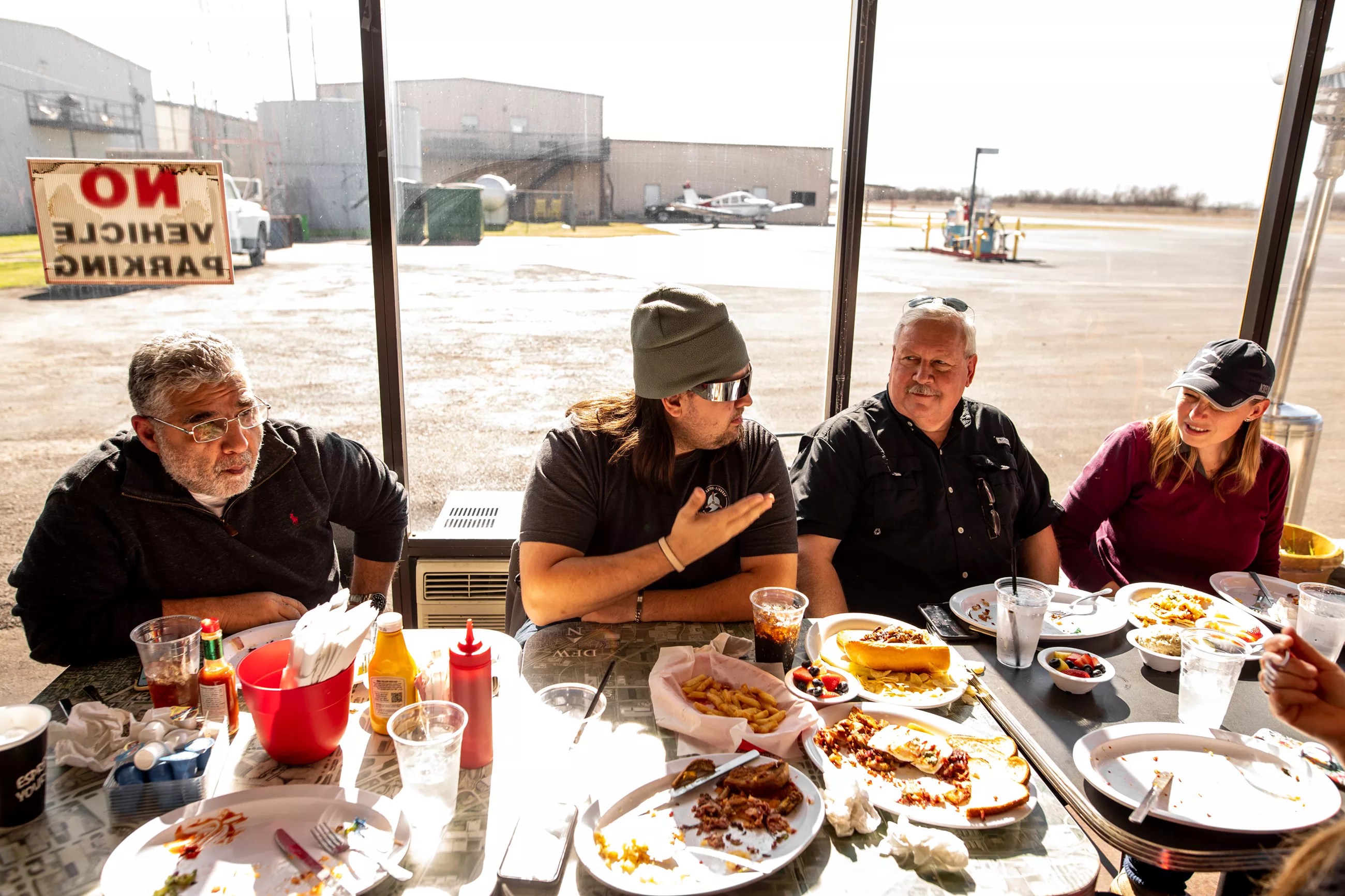 Five pilots sat around a table over lunch recently, discussing gumbo, cargo flights out of Winnipeg and getting stuck in a holding pattern. They were at Ardmore Municipal Airport in Oklahoma watching planes come and go from the dining room at Jake’s Joint. Pilots talk and eat at The Beacon Cafe at Hicks Airfield outside Fort Worth. Kathy Tran