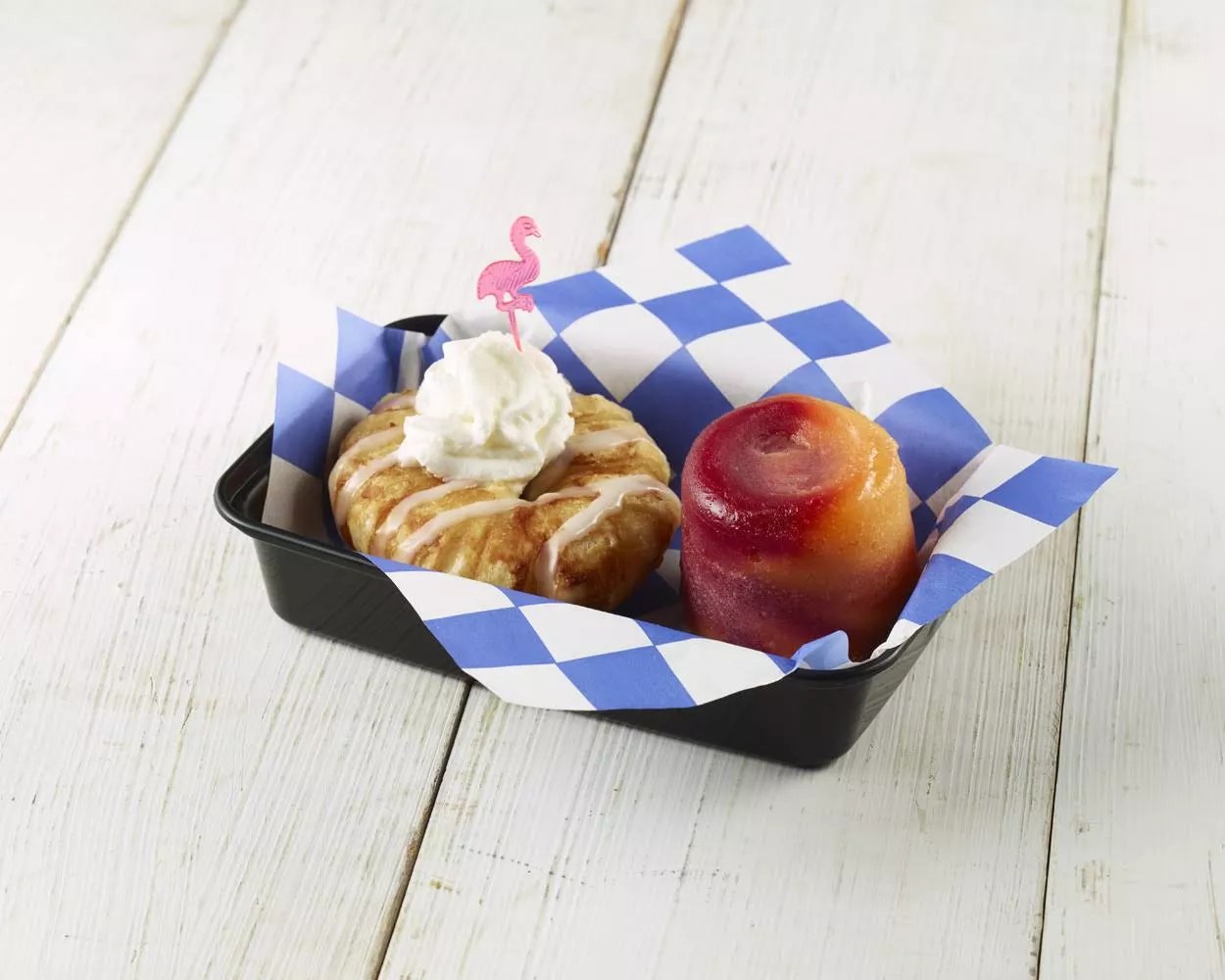 Blending the two categories of savory and sweet, this dish aims to dethrone the mighty chicken and waffles with its combination of fried and sweet. Homemade Big Red soda-flavored icing is slathered on a doughnut and topped with a deep-fried chicken wing.