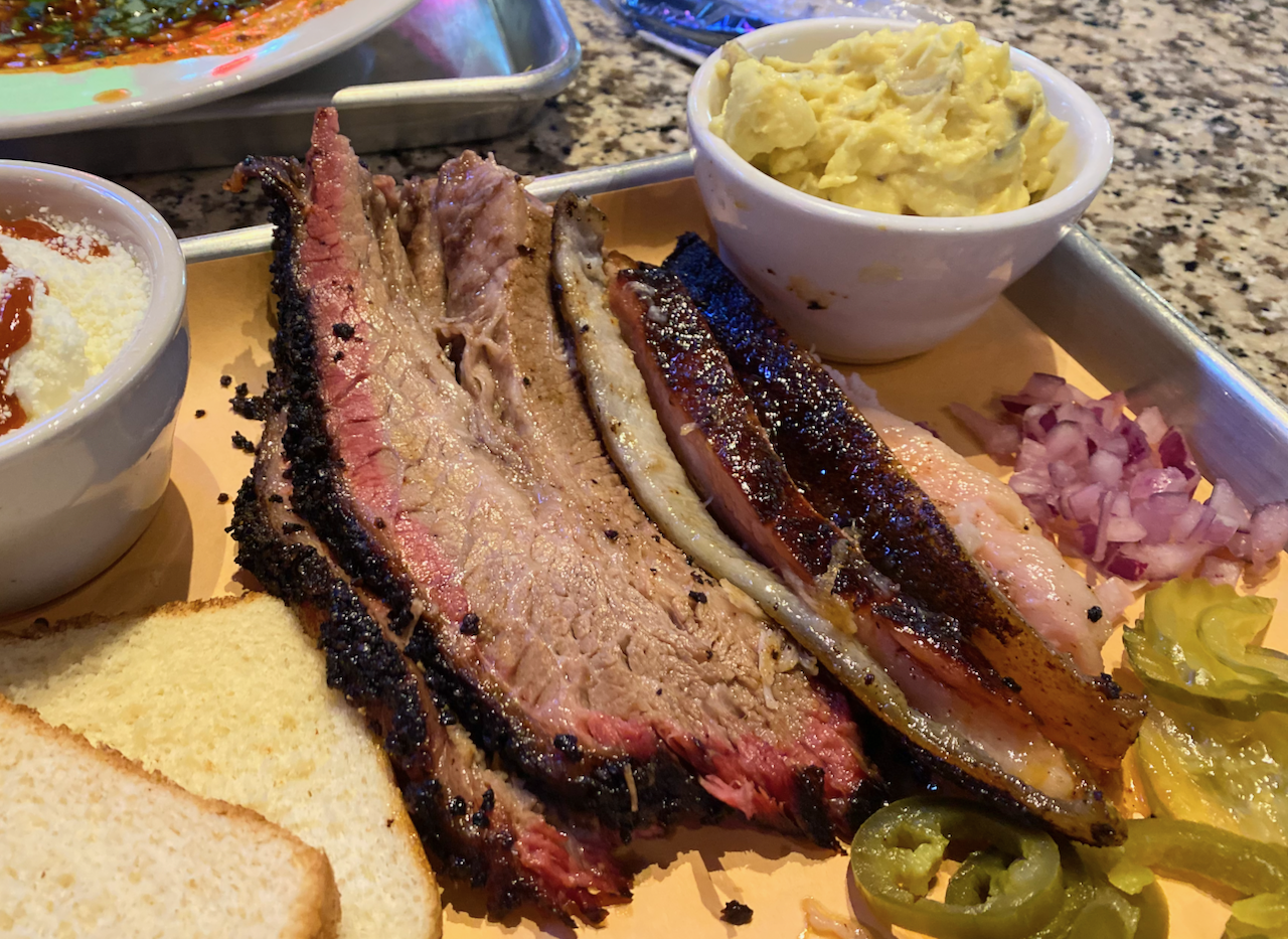 We also got a two-meat place with a hot honey-glazed pork belly, which was some kind of dark magic. For our second meat, we chose brisket, with an on-point crunchy bark over a thin layer of fat and tender meat. We’ve long liked 225’s elotes, so we got an order of that along with a potato salad (with a mustard base). It all made for a memorable meal.