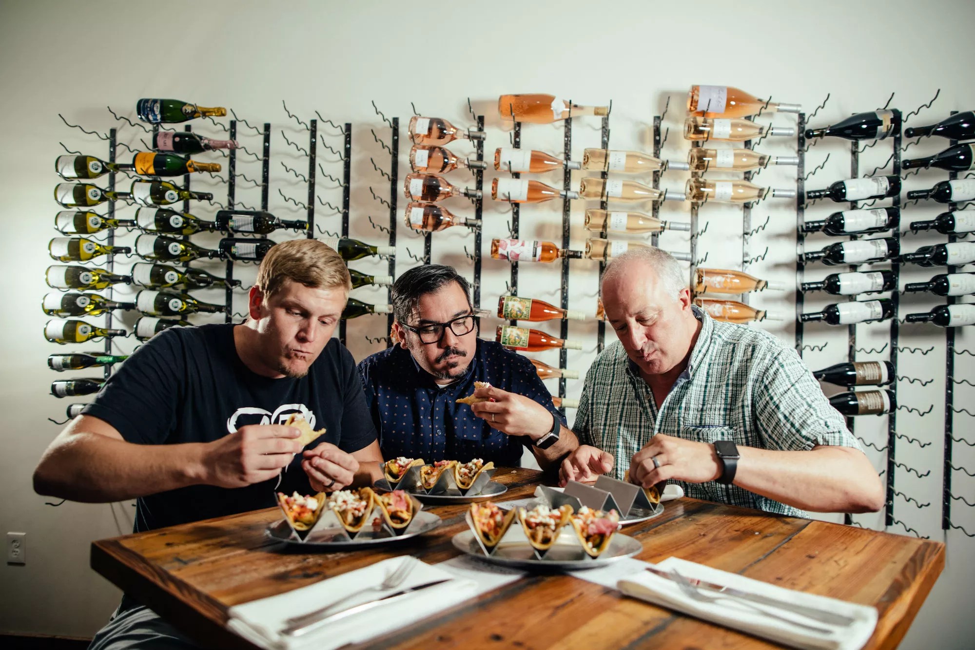 (Left to right) Foundation45 CTO Joe Van Oflen, taco writer Jose Ralat and Jon Daniel sample tacos at Taco y Vino, one of the 48 places Ralat and Daniel will visit during 24 Hours of Tacos.