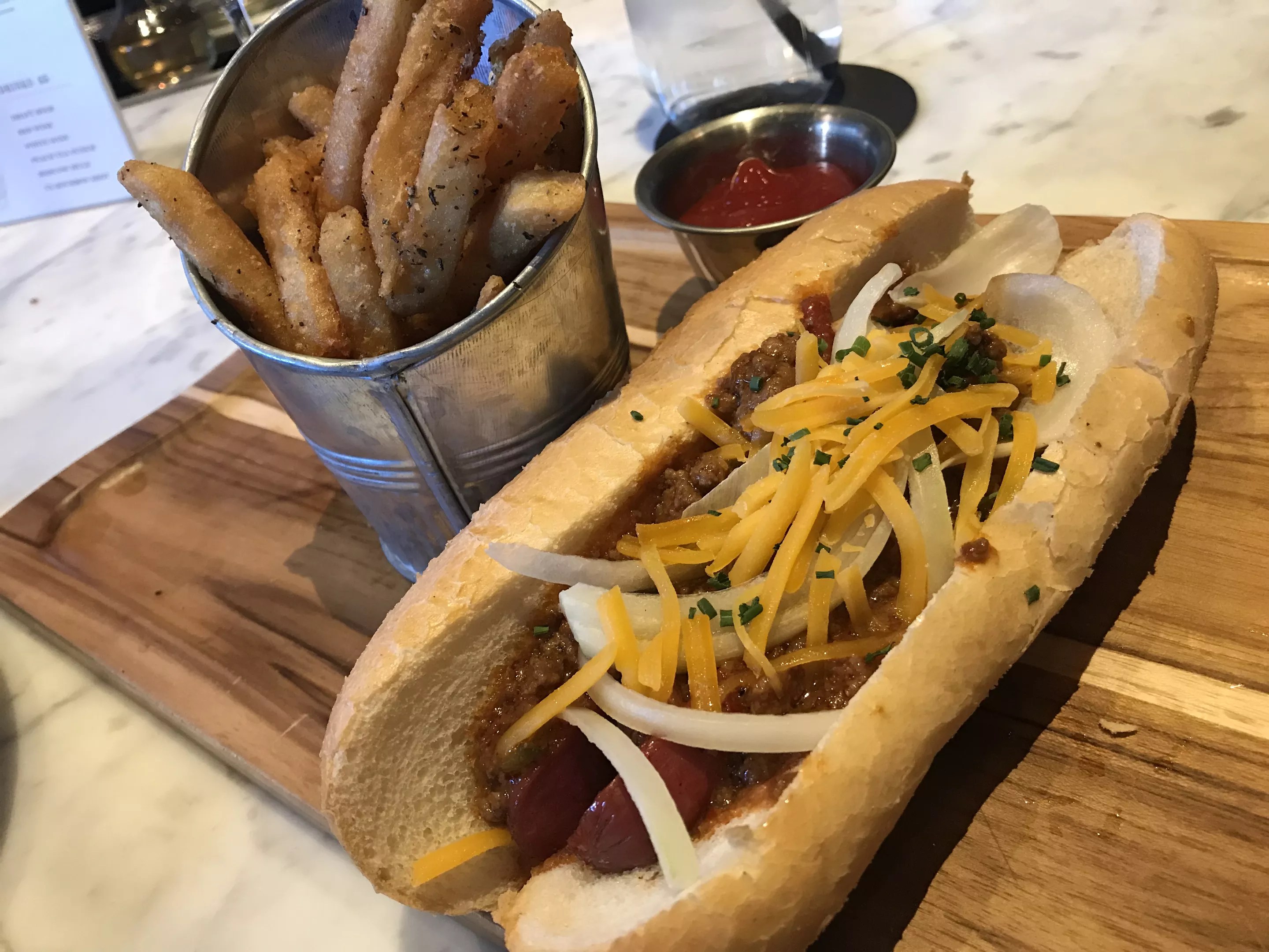 Elm Street Cask and Kitchen’s happy hour chili dog is a bargain.