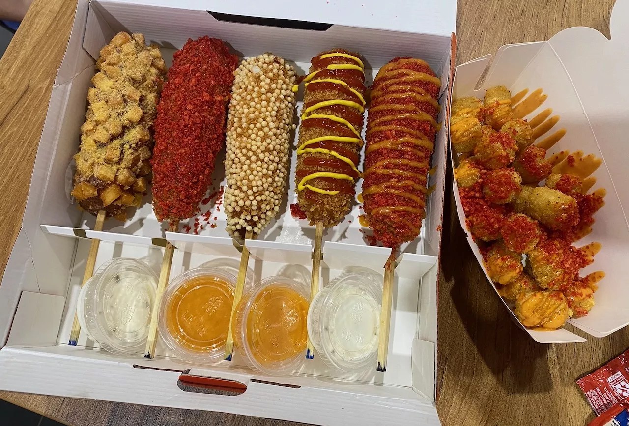 Speaking of stepping outside of traditional, we recommend exploring the latest craze when it comes to battered and fried hot dogs on a stick: Korean Dogs. One place to check them out is Oh K Dog. These are different from traditional corn dogs in that they use a rice batter versus a corn batter to coat the dog before frying it. They also add different toppings to the batter (cubed potatoes and hot Cheetos, for example). And you can get a mozzarella cheese stick instead of a hotdog at the center, or half of each. Pair it with one of the sweet or savory seasonings and dipping sauces and you will have the perfect snack on a stick.