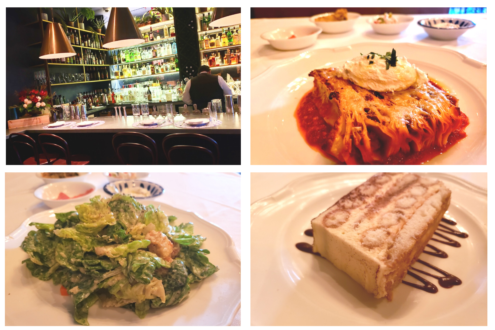 The bar at Fachini (top left), 50-layer lasagna (top right), a Cesar salad and tiramisu.