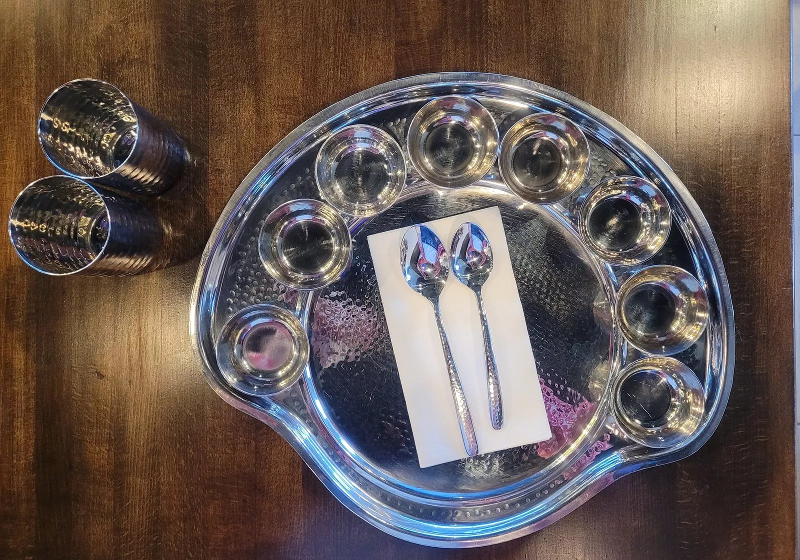 A stainless steel thali containing a main circular plate with eight small bowls atop the arc is set on the table. Then a parade of servers approaches, carrying a set of serving bowls with four different dishes. The entire thali platter is slowly filled like a peacock slowly revealing its colorful feather fan – paneer (cheese), channa (chickpeas), subji (mixed vegetables) and more in regional style sauces.