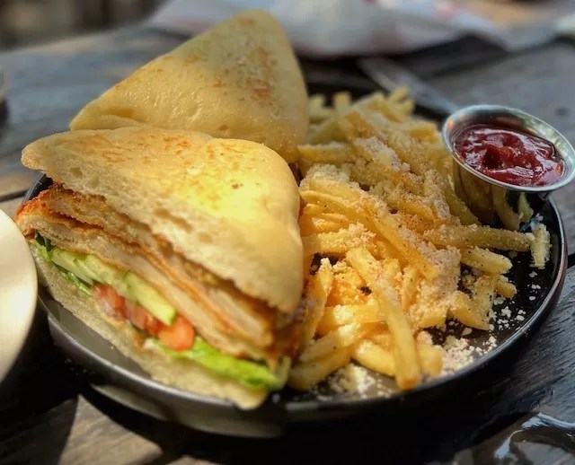 The Schwarzenegger Sandwich comes with a thin, breaded pork cutlet with cucumbers, tomatoes and mayo served on a toasted ciabatta. This sandwich is served with crispy shoestring-type fries topped with Parmesan cheese, which stole the show and paired perfectly with the spirits and the occasion.