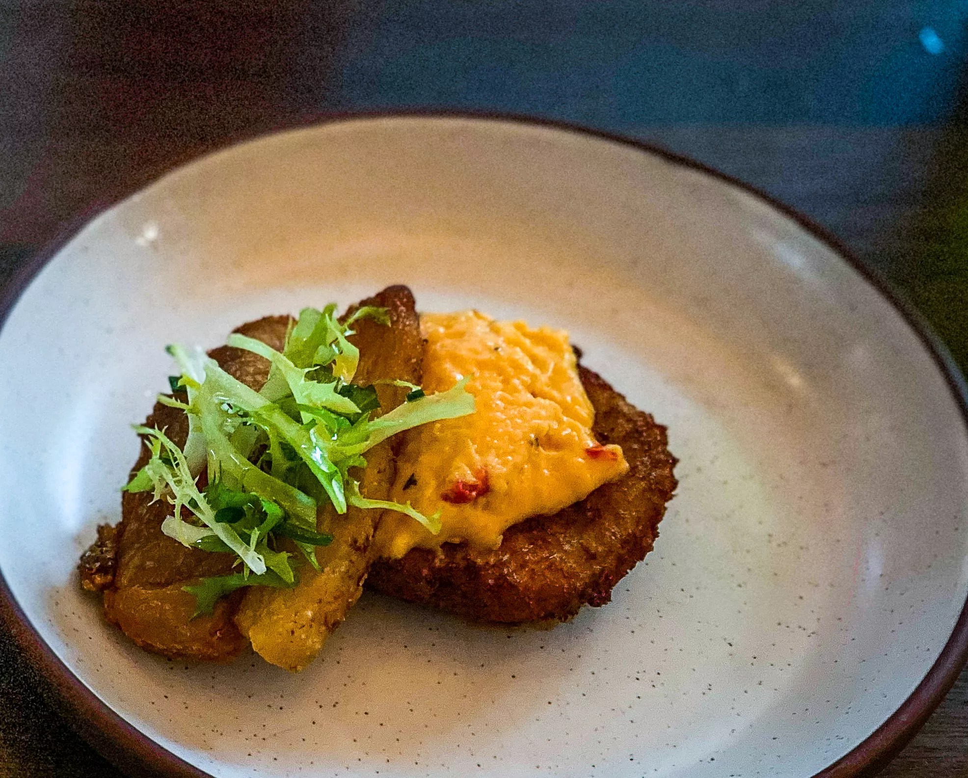 Fried green tomato BLT: house-smoked pork belly, pimento cheese, frisée, smoky tomato jam, lemon vinaigrette.