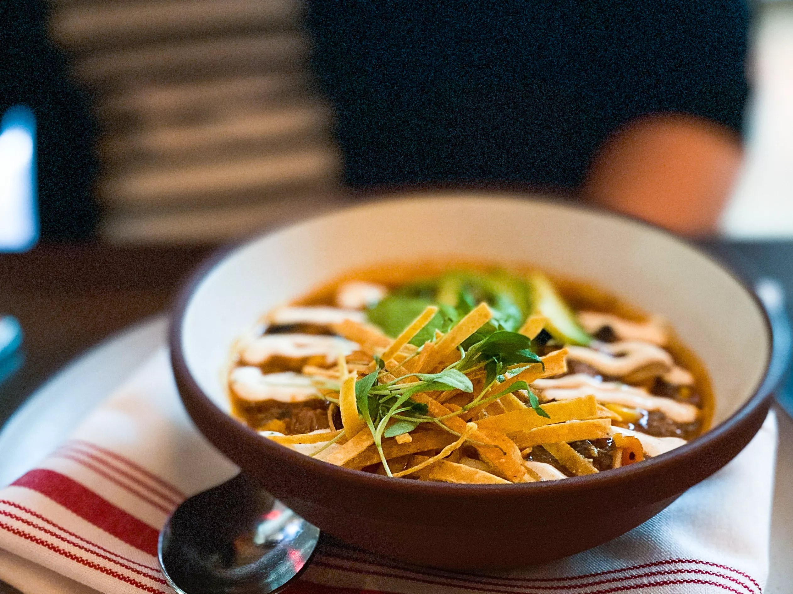 With that out of the way, how were they? The BLT was really flavorful and full of nice contrasting textures between the pork belly and tomato. It was, however, just one, and a small one at that. This was more of an amuse-bouche than a starter. The soup, on the other hand, was a full bowl, and was rich with southwest flavor and also a party of textures, as well as what appeared to be an entire sliced avocado. Chicken tortilla soup: crispy tortillas, fresh cilantro, cumin lime sour cream, fresh avocado. Hank Vaughn