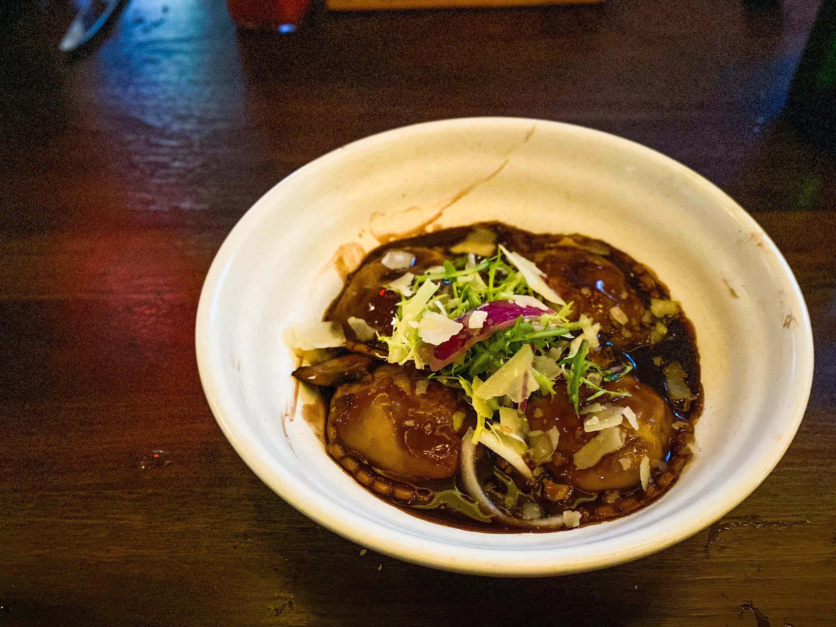Housemade short rib ravioli: baby portabella, frisée & red onion salad, truffle oil, shaved Reggiano cheese, red wine cream sauce.