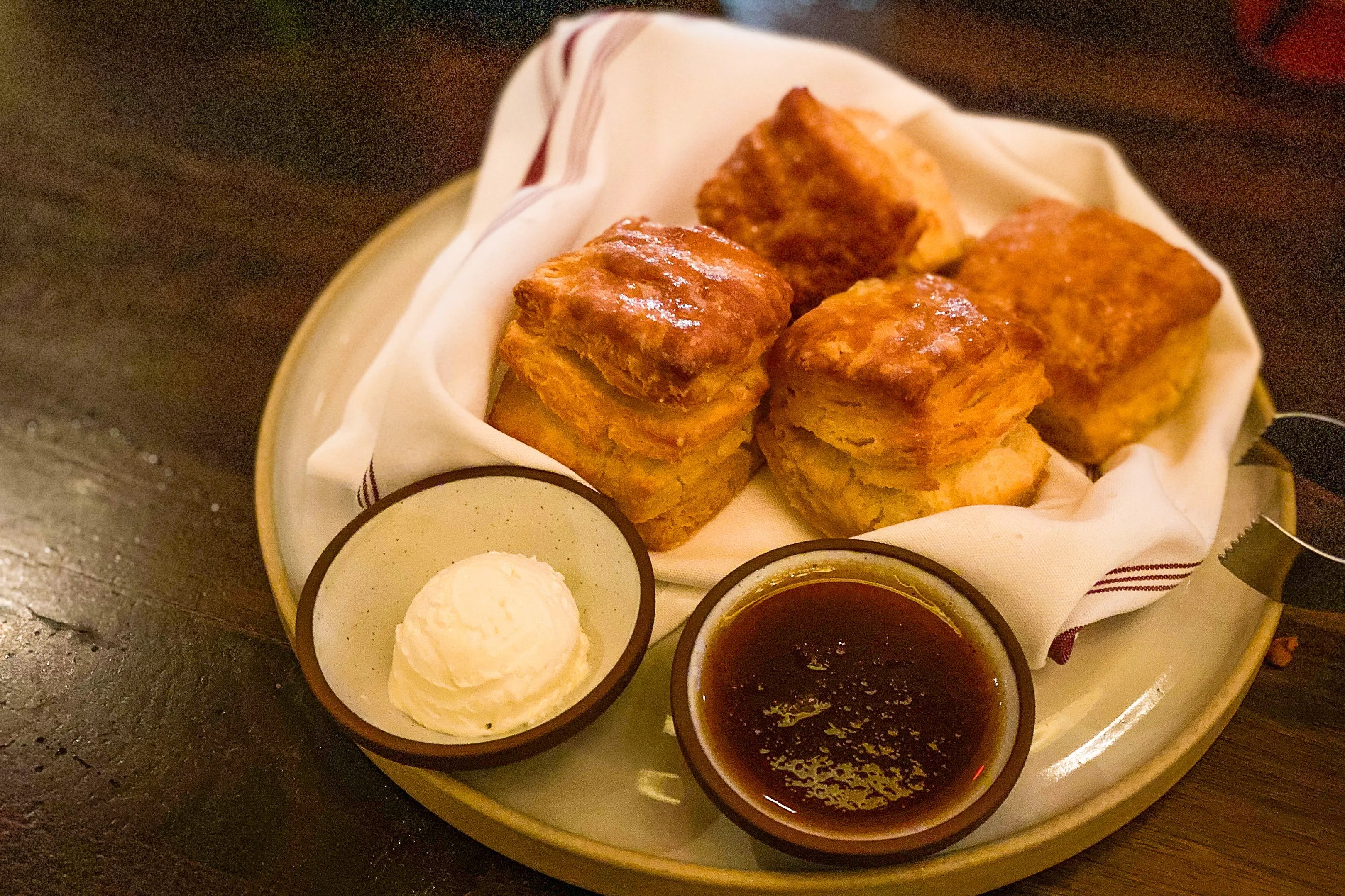 The ravioli was portabella, short rib, truffle oil and Reggiano cheese with a red wine cream sauce. This is $32 on the regular menu, and we’re not really sure if the serving size is comparable. It’s extremely rich, and a little goes a long way. Perhaps it could have had a brighter flavor component, as it seemed a bit muddied in the darker notes, both visually and in terms of flavors. Buttermilk biscuits, honey butter, house-made jam. Hank Vaughn