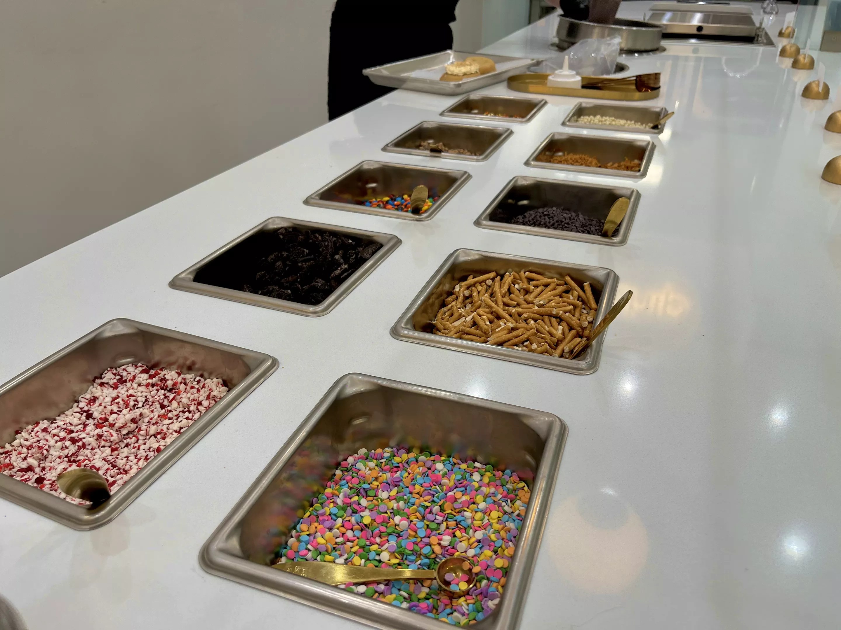 Don’t forget to indulge in the full-service cookie bar at the front, a counter that offers a slew of colorful toppings ranging from drizzles to candy and other crunchy additions. For an extra 99 cents per cookie, add infusions of condensed milk, white chocolate or melted caramel, or toppings like homemade cream cheese frosting or more chocolate chips. Preset cookie creations like the tres leches and Oreo Dunk are some of the spot’s customer-backed favorites.
