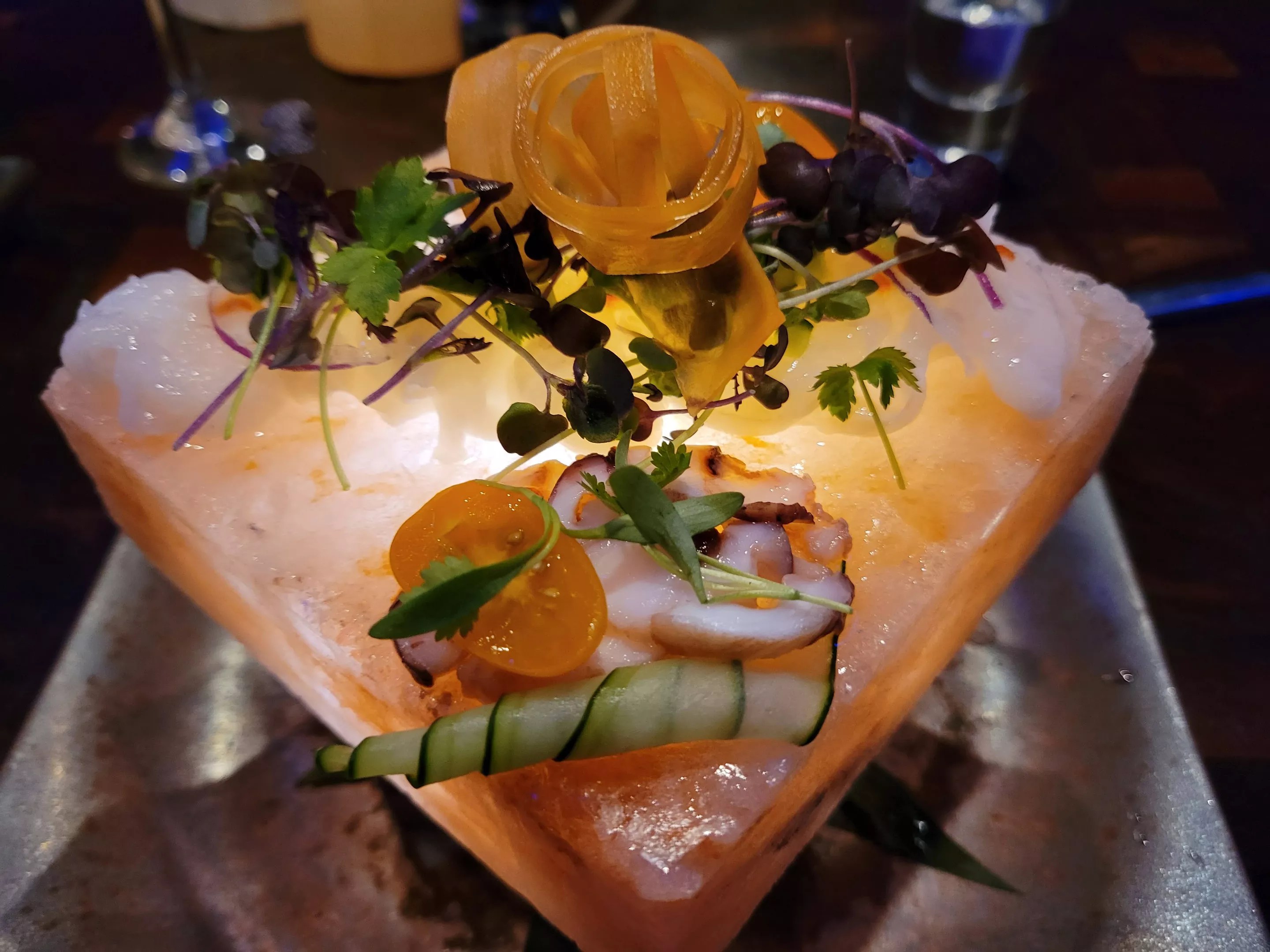For the final plate tako (octopus) sashimi was set on a large salt rock with glowing lights inside. Although this dish was very Instagrammable, it fell short on taste. The thinly sliced octopus absorbed a lot of the salt from the rock, which made it hard to enjoy. Octopus sashimi EMayne
