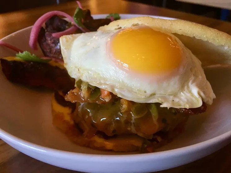 The arepa burger at Shoals is topped with a fried egg and will set you back only during happy hour and otherwise.