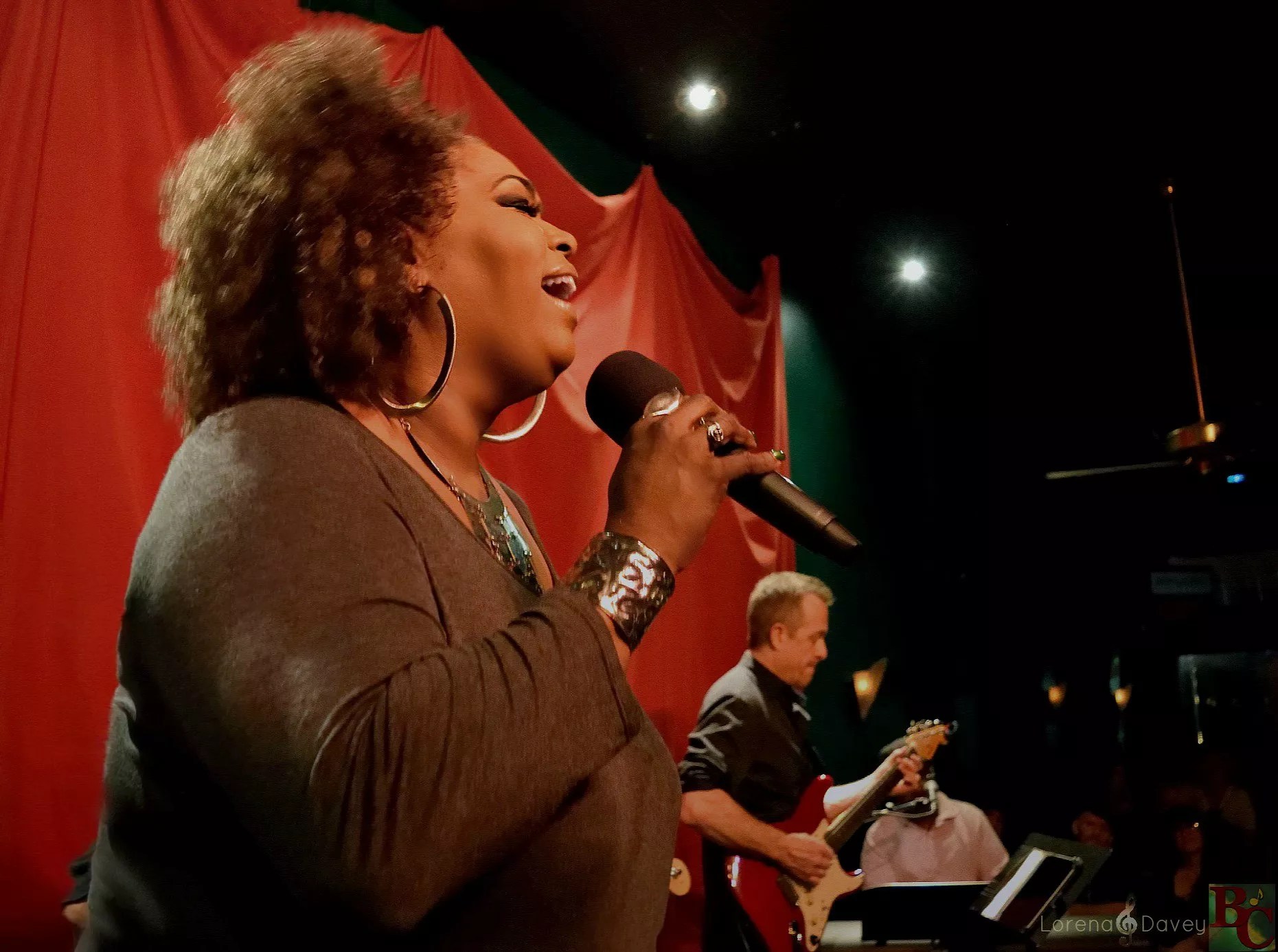 Actress and vocalist Liz Mikel, a Dallas native and company member at the Dallas Theater Center, belts into the microphone.