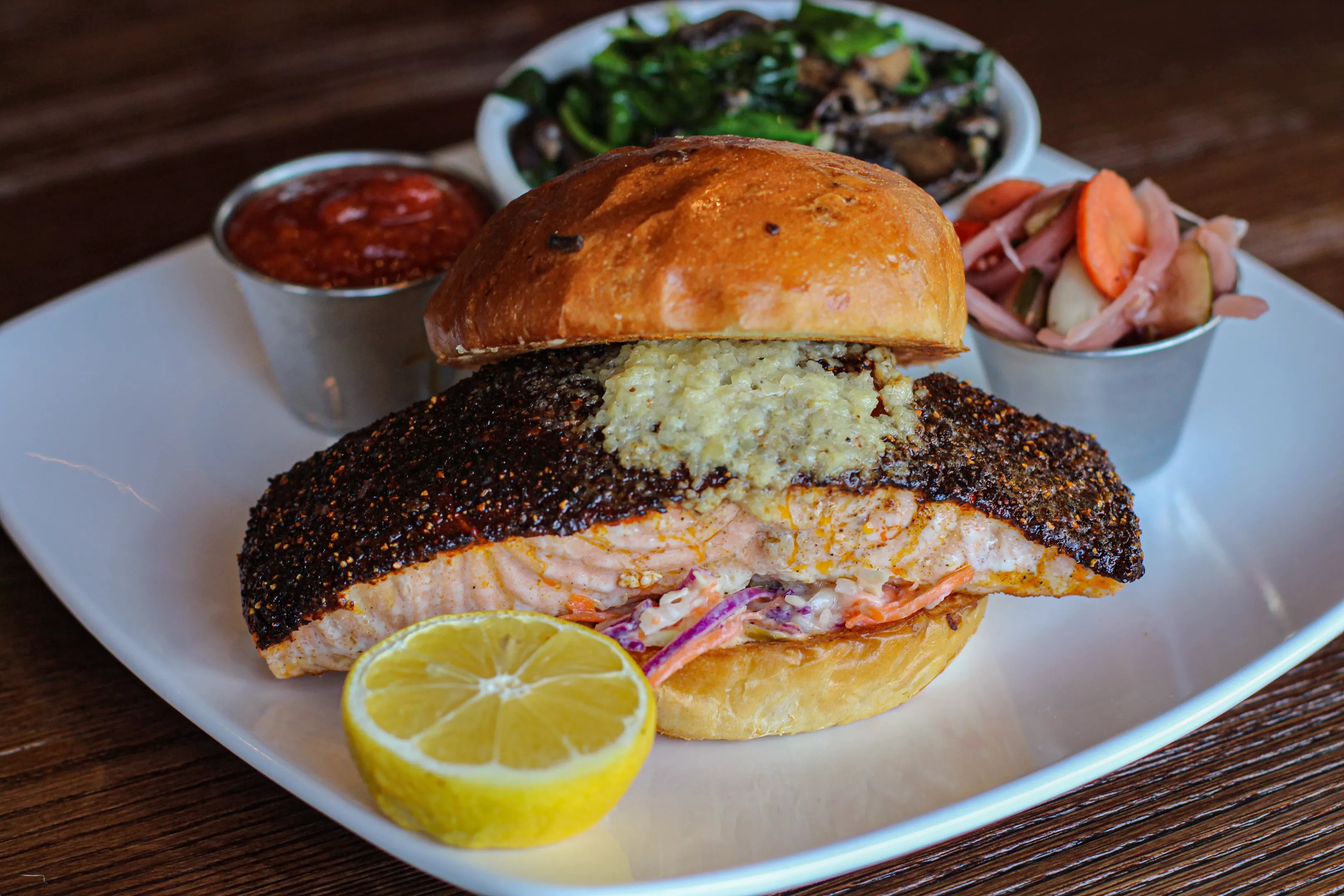 Five different grilled cheese sandwiches show off Dickerson’s years with Dallas Grilled Cheese Co. Burgers are big and bold, and you can get salmon fried up into fish and chips ($17.95) or blackened and served over cheesy grits ($17.95).