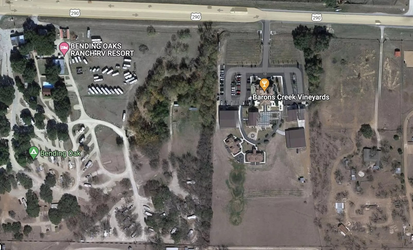 Finally, we look up the vineyard in Fredericksburg to see whether there is a production facility or even vines. In the back of the facility, it looks like a cat scratch across the land of vines and the front yard seems to have vines, but hard to tell. Alas, certainly not enough to supply a wine club.