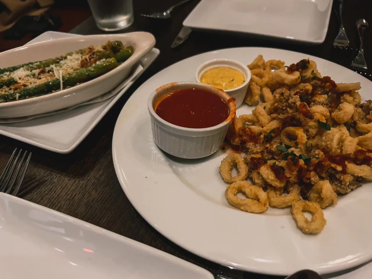 We opened our meal with an order of asparagus ($15), perfectly cooked and topped with Calabrese chili oil and Parmesan. And since our beloved Dallas Stars were facing off against the Kraken up in Seattle, we couldn’t resist an order of calamari ($17) to get in the spirit. The calamari is crispy and light, not even the slightest bit greasy. But that crispy batter hides much of the seafood flavor. That didn’t stop us from eating the entire plate, alternating dips in the sweet and tangy marina and a remoulade.