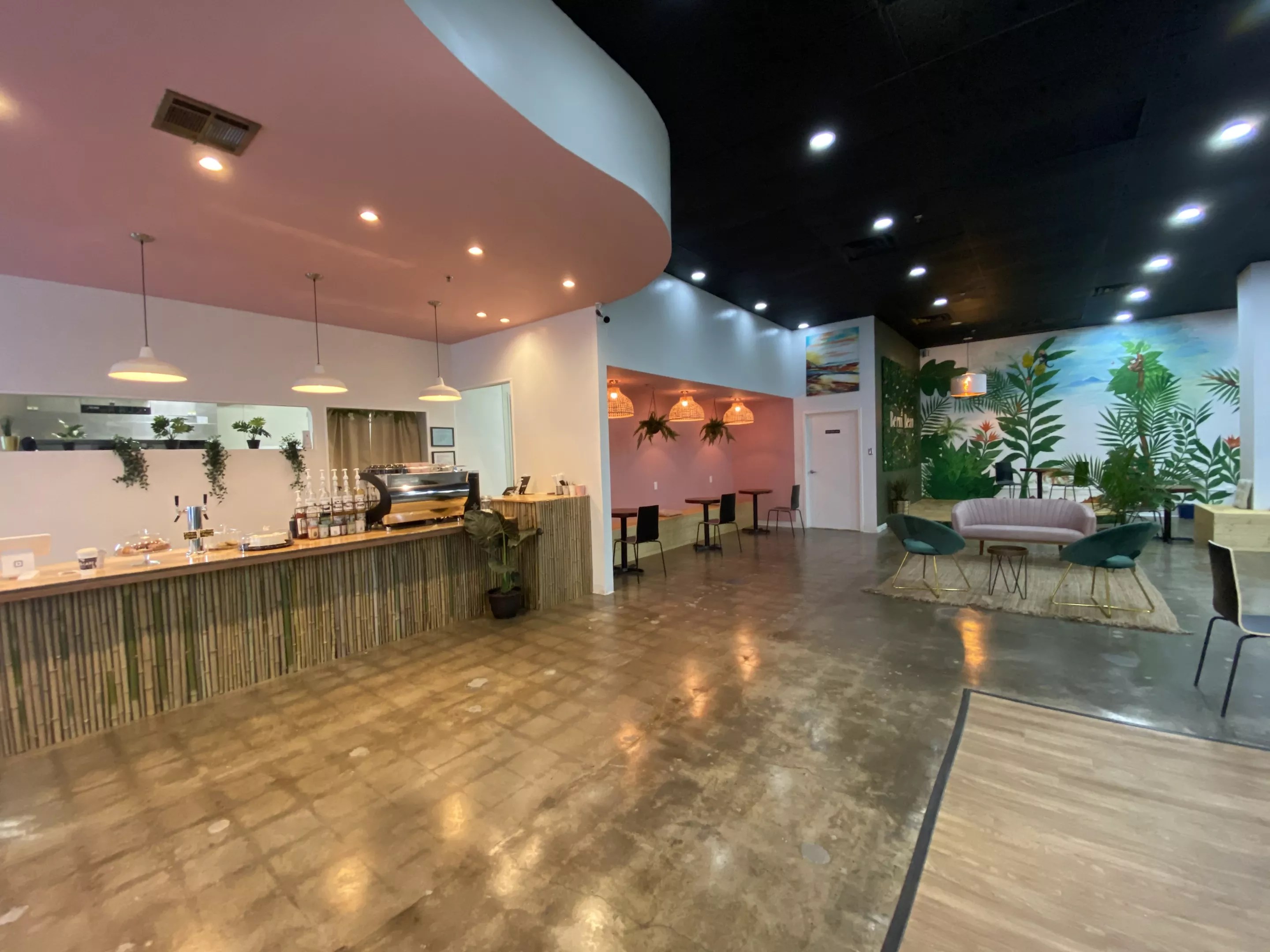 A small stage offers a space for the coffee shop to host live music in the future, and the area will also be used as a space for other small businesses to show their products. The whimsical mural on the back wall represents the rainforest, and an Instagrammable photo wall depicts greenery that carries the tropical theme forward.