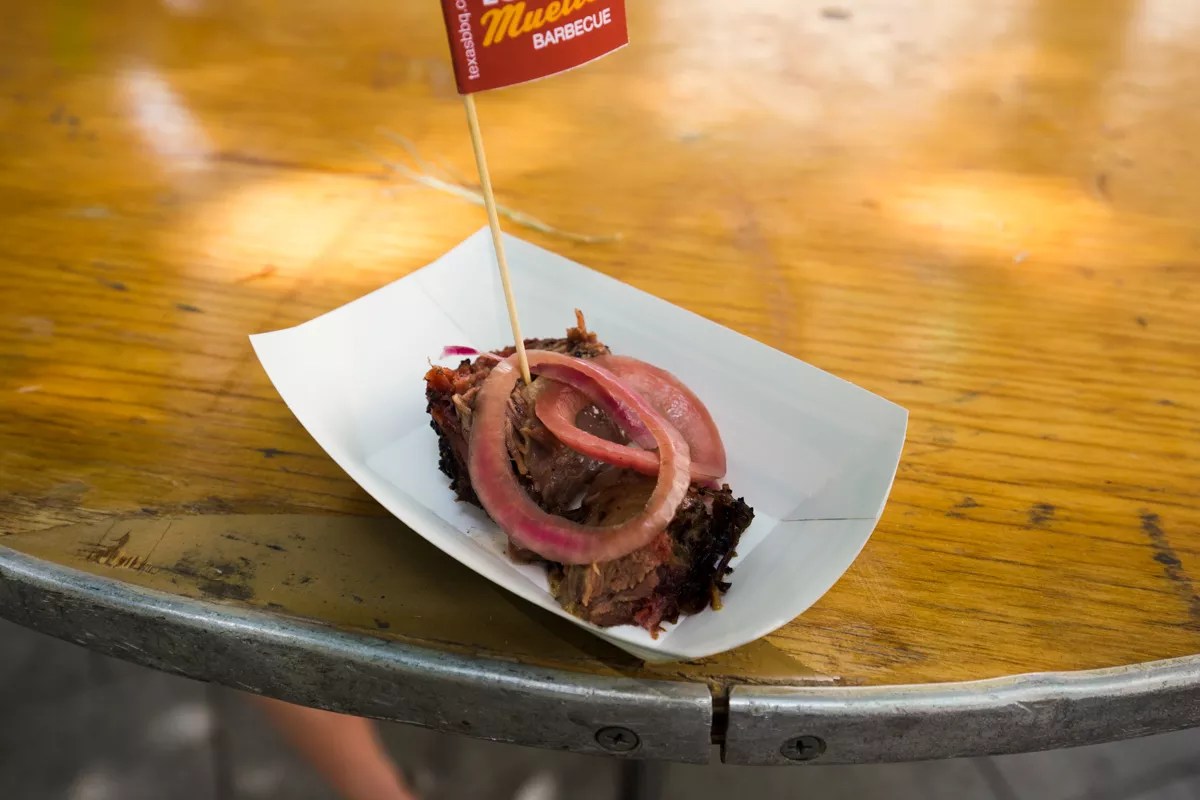 Louie Mueller has something that’s hard to find in Dallas barbecue — history. They’ve been smoking meats in Taylor since 1949, and this simple bite of moist brisket topped with a pickled onion shows off everything they’ve learned in almost 70 years of barbecuing.