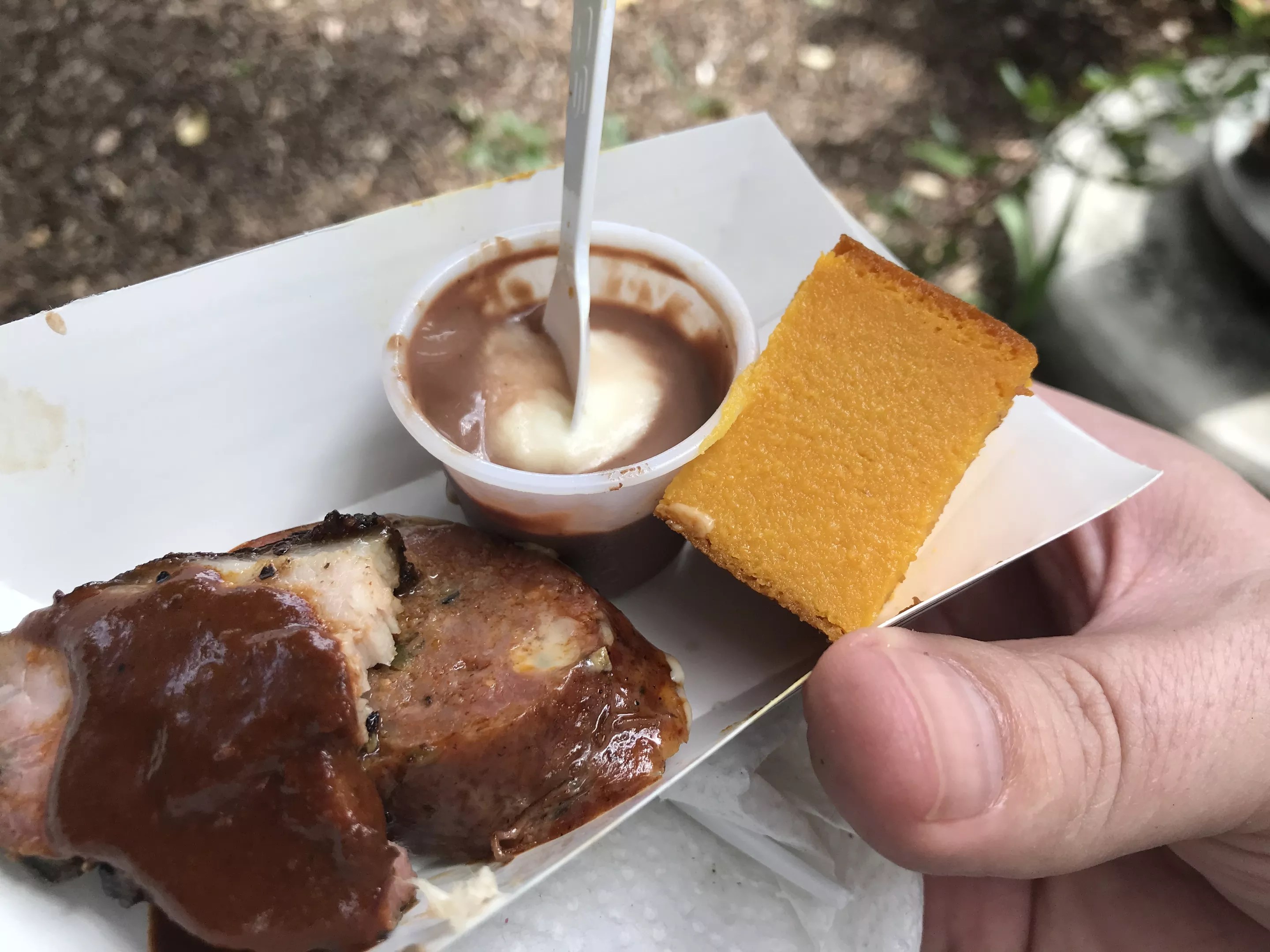 Tejas Chocolate & Barbecue gave us a full meal experience in a tiny paper tray. The juicy sausage and smoky brisket (topped with their amazing sauce) were the entrees, then we finished off with a chocolate mousse and carrot soufflé for dessert.