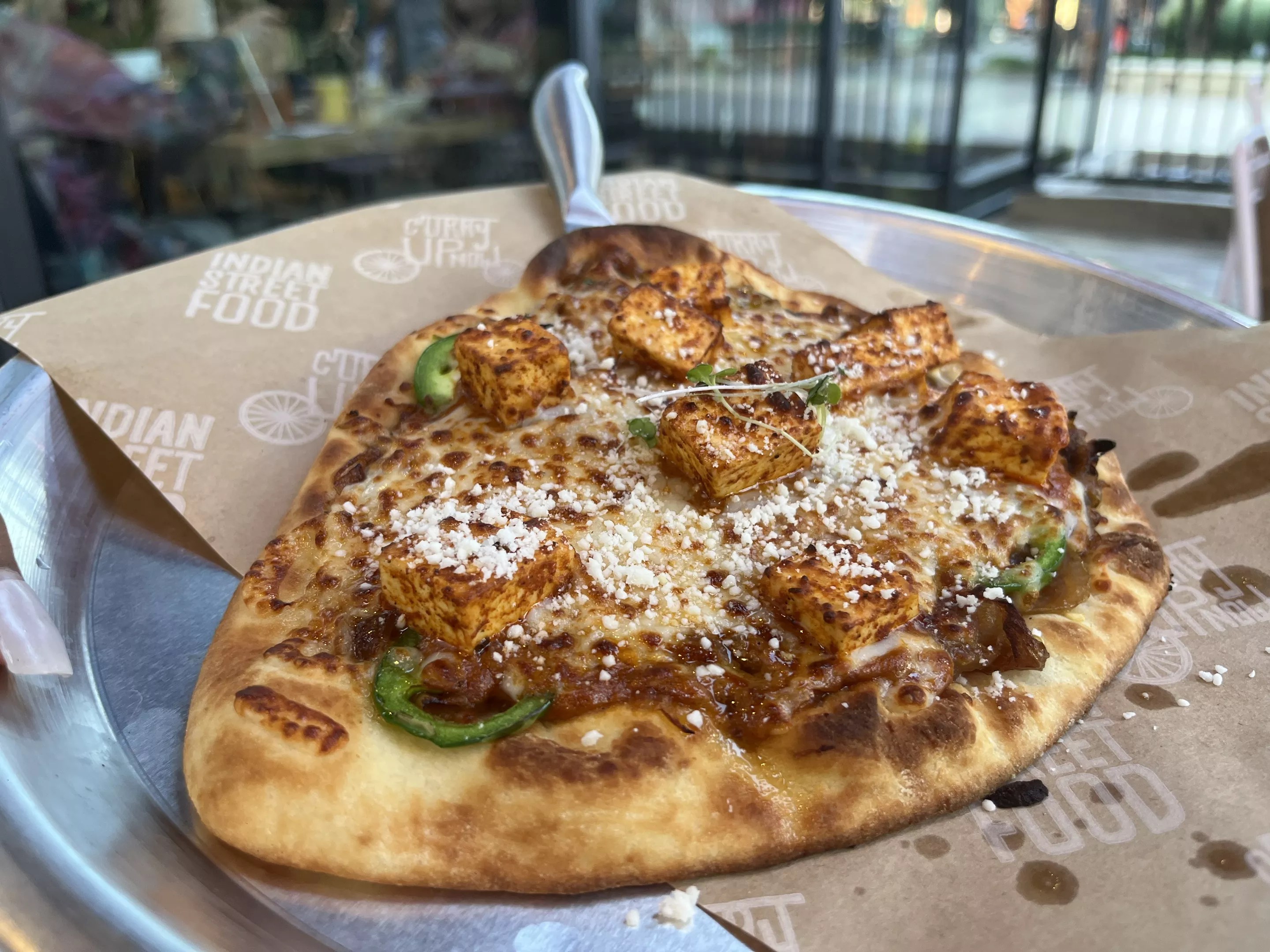 418 N Bishop Ave. Fine dining is taken to a new level at Bishop Arts District’s jewel, me. The restaurant opened in 2021 and is owned and operated by chef Afifa Nayeb. Treading the small, yet powerful space between French and Indian food, me offers different menus for both brunch and dinner – with the latter more popular. For brunch try the biryani fried chicken and waffles, which comes with masala-marinated, deep-fried chicken atop a fluffy Belgian waffle. The French toast is made of a slice of brioche bread, dunked in a cardamom-spiced custard. Dinner specialties include pistachio-crusted lamb chops, calamari pakora and paratha croissants. Elegant plates and colorful decor elevate the fine-dining experience. CurryUp Now’s signature “naughty naan” comes with masala chicken or cheese on top. Anisha Holla
