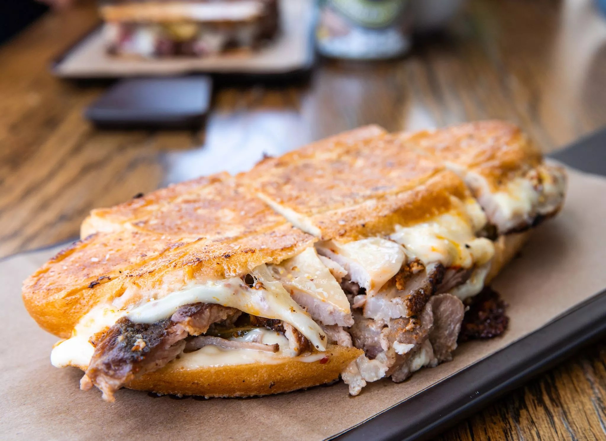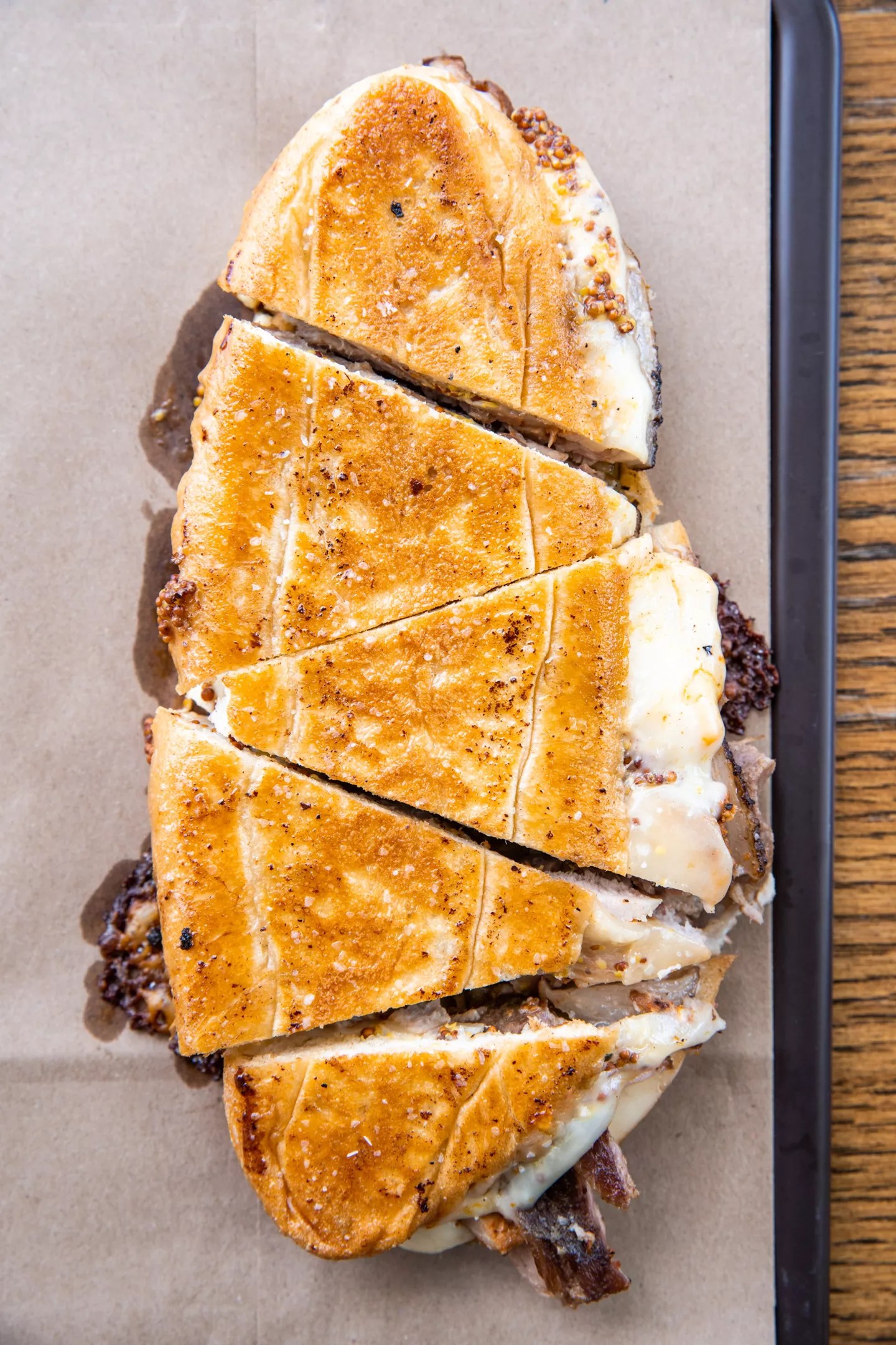 You can hear this precise sound at Brown Bag Provisions. Their “Cuban-ish” sandwich is one of Dallas’ new gems. Its thick rounds of porchetta, imbued with herbs and salt, sit on a blanket of Muenster cheese, tangy pickles and whole mustard grains adding electricity in between an Esmeralda’s Bakery roll. All of that is compressed until the bread forms a buttery shell. They slice it into shards and triangles. It cracks and breaks loudly when you take a bite.
