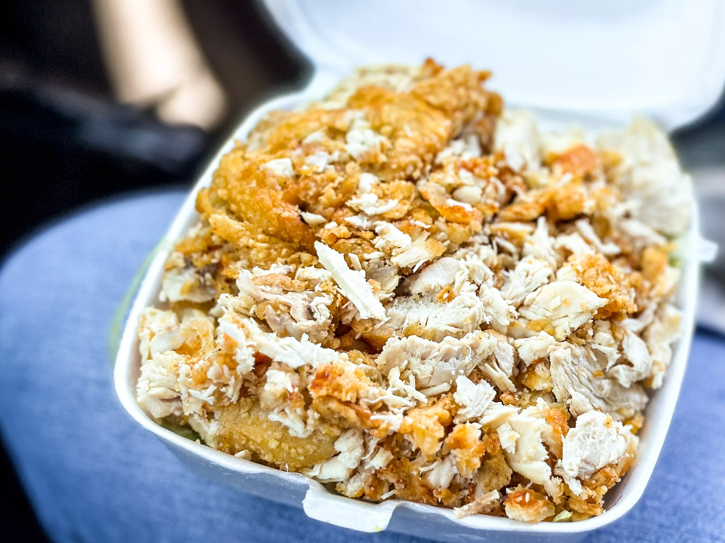 The chicken salad consisted of chopped lettuce, tomatoes, onions and a bunch of sliced and diced fried chicken breast pieces piled on top. This was the small version, and it was almost too much. Included with the salad were the “bones” (presumably from the source of the chicken that was in the salad), wrapped separately. They may be called bones, but they made a lunch meal the next day just by themselves: plenty of juicy meat remained along with some wonderfully crispy and flavorful fried skin.