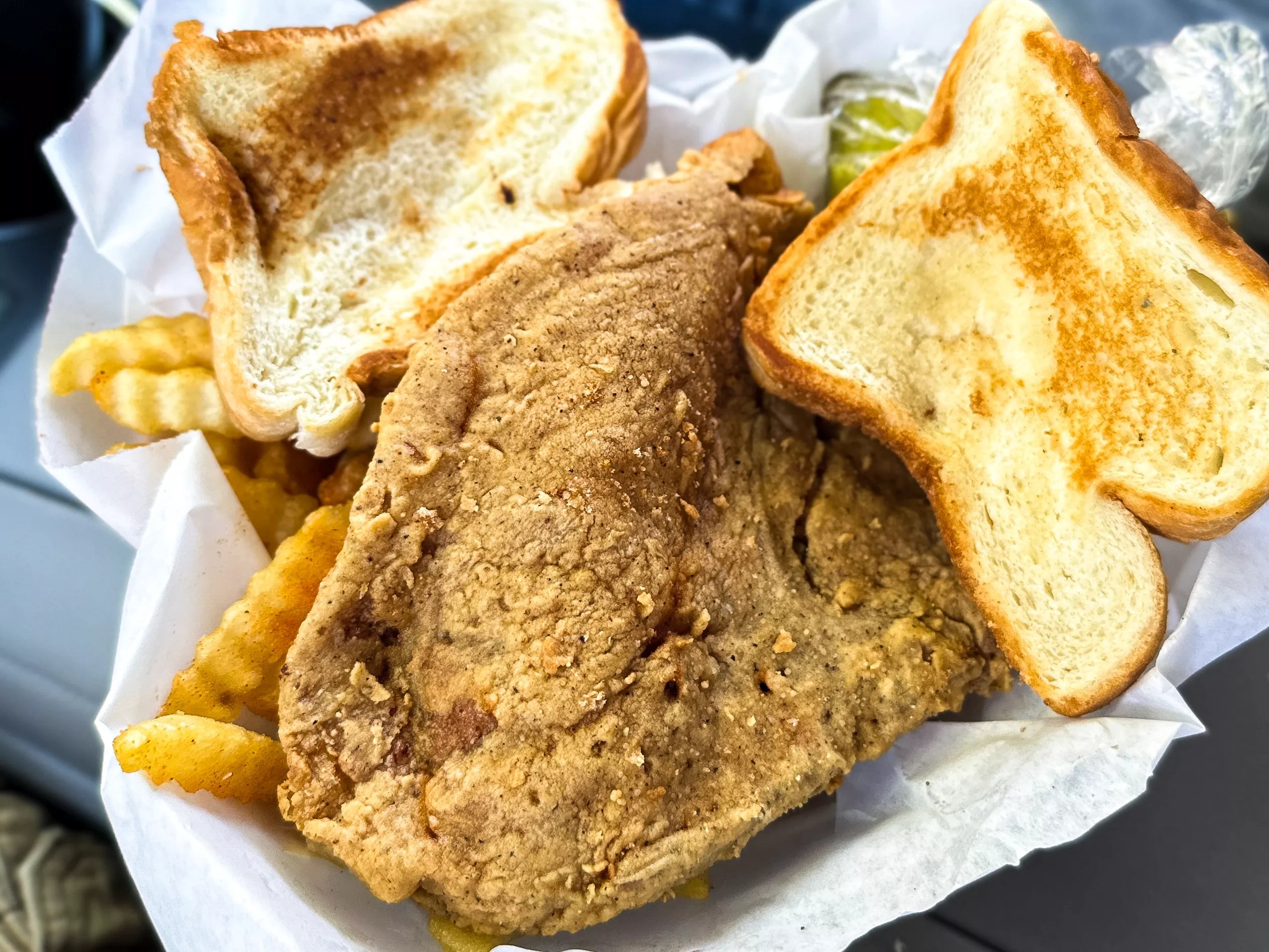 Fried pork chop basket, including fries, toast, jalapenos and pickles. Pretty... pretty good.