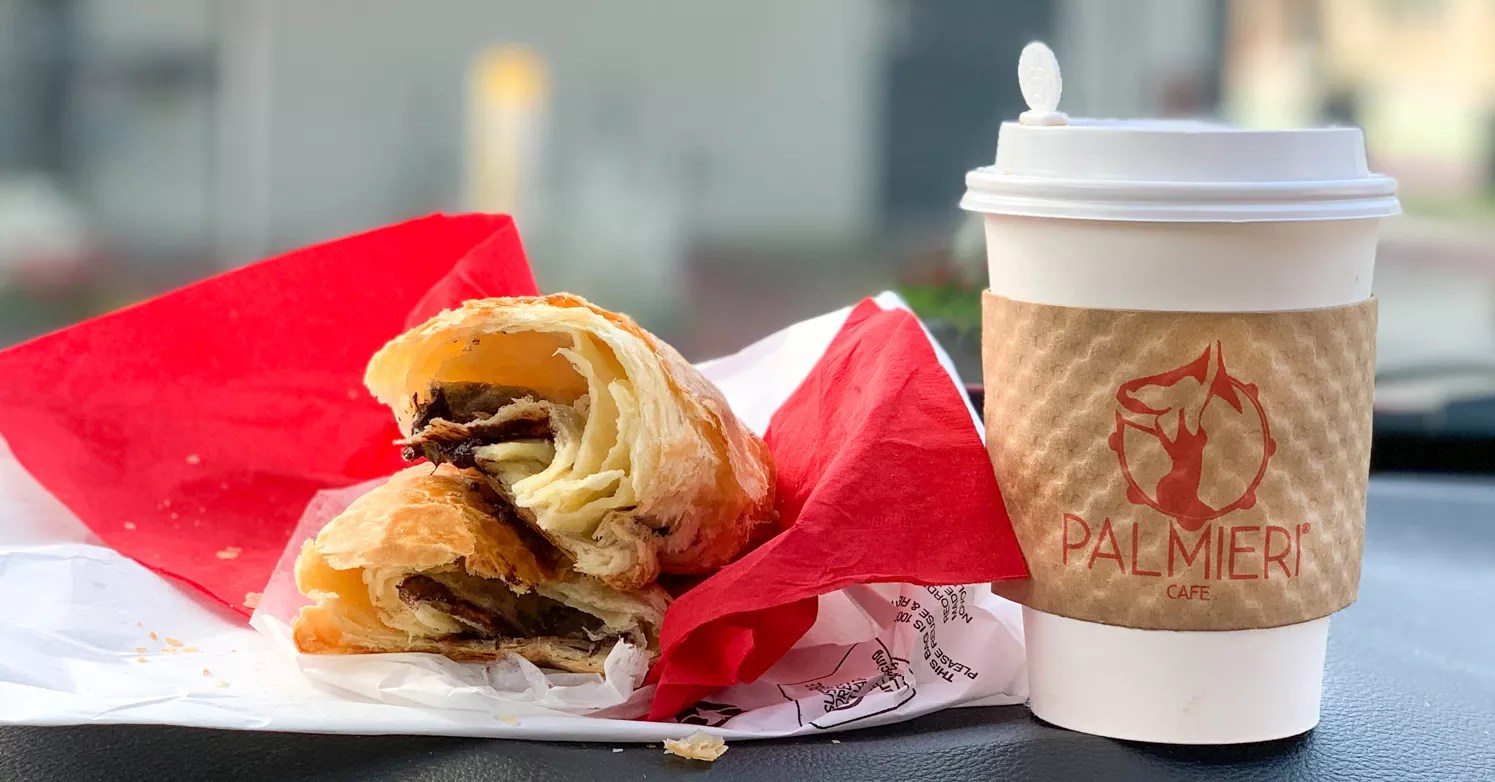Chocolate-filled cornetto and Americano to go from Palmieri