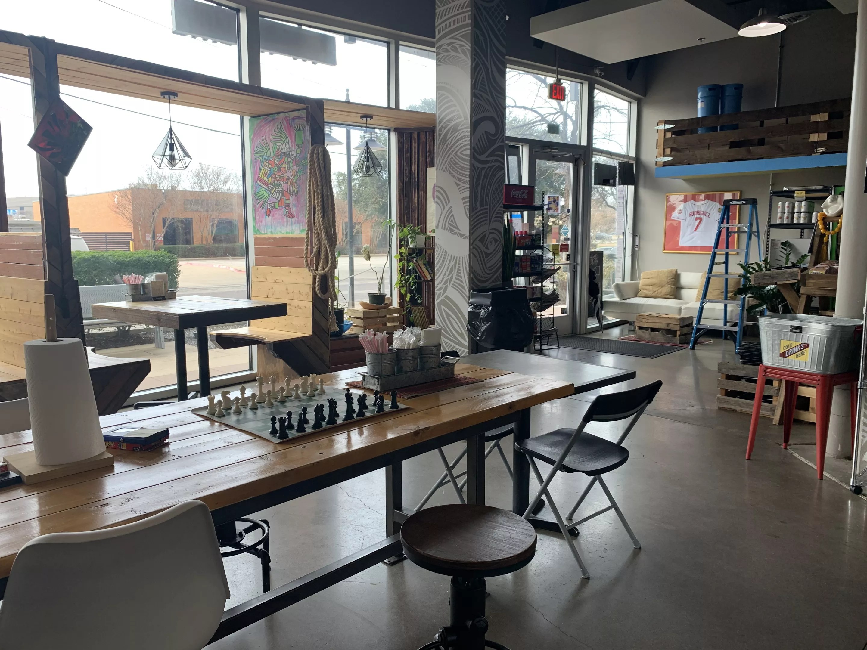 He’s behind the register on a recent visit, wearing a bright smile. He sits with a co-worker who uses some down time to bottle his coffee, a powerful cold brew called Night Rider. All around Zhu are the fruits of his labor – planks of wood fashioned into seating, panels that showcase the work of local artists (there’s also a vending machine filled with rolled works of art), local sodas, condoms, batteries, Reese’s Puffs cereal, cigarettes – they’ve thought of everything.