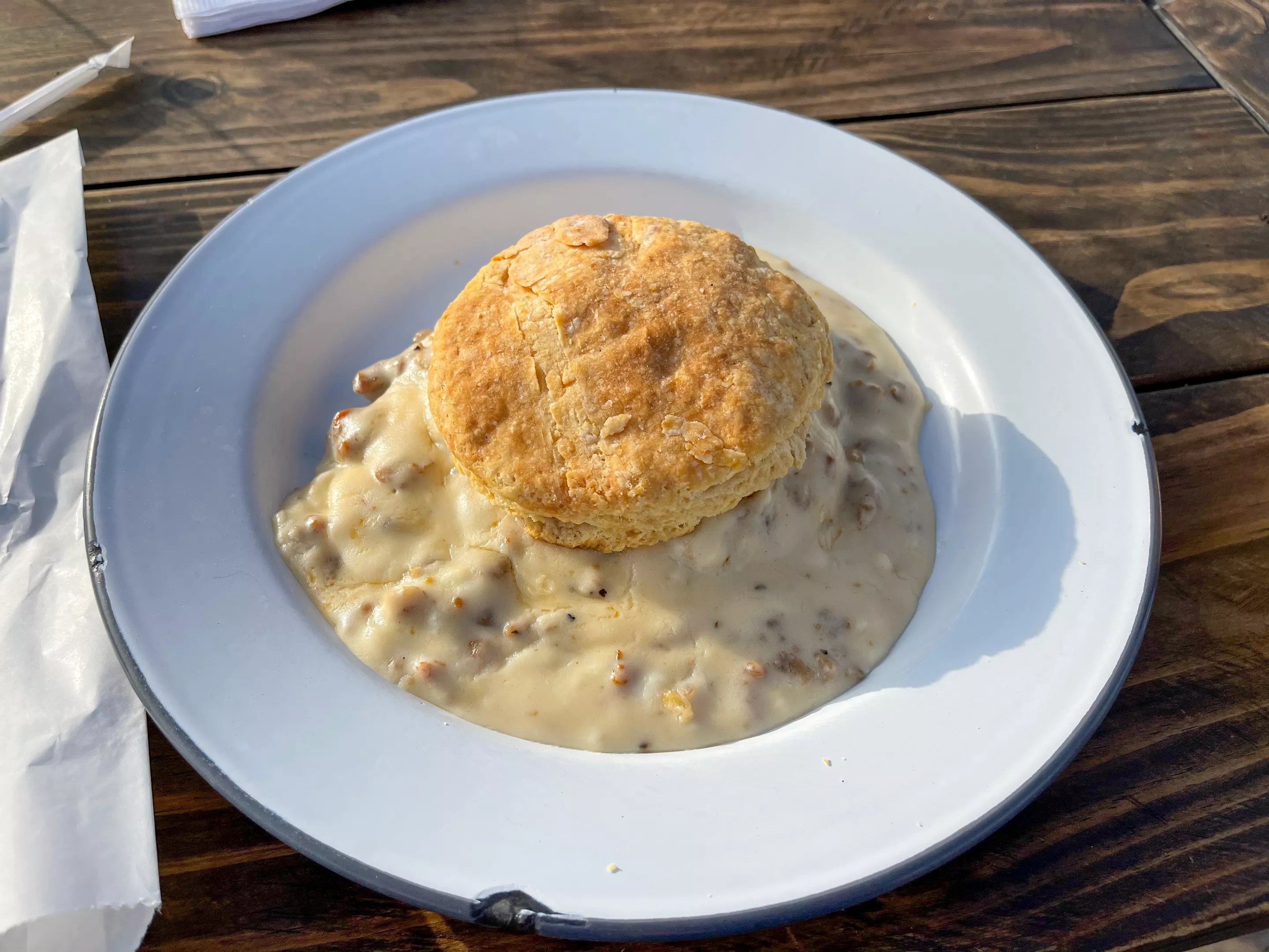 The biscuit with gravy at Bonton Market takes up the whole plate.