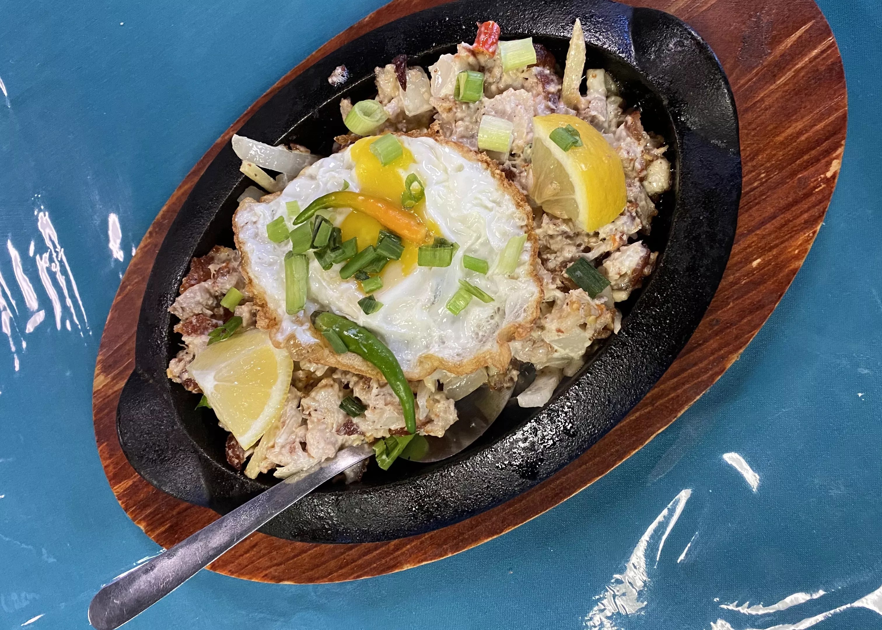 Sisig: spicy, fatty, crispy and aromatic pork belly topped with fried egg and served on a sizzling plate.