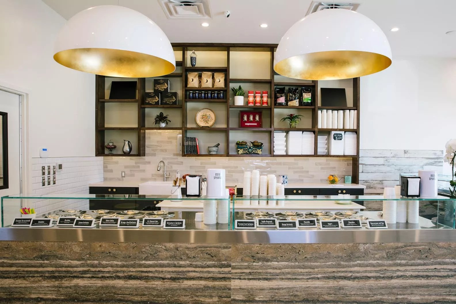 The shop is modern and open, with bright, whimsical murals painted on the interior walls. Two giant white and gold half-dome lights hang over the marble-fronted gelato case. Sit at the bar along the wall or in the front window. There is also seating outside.
