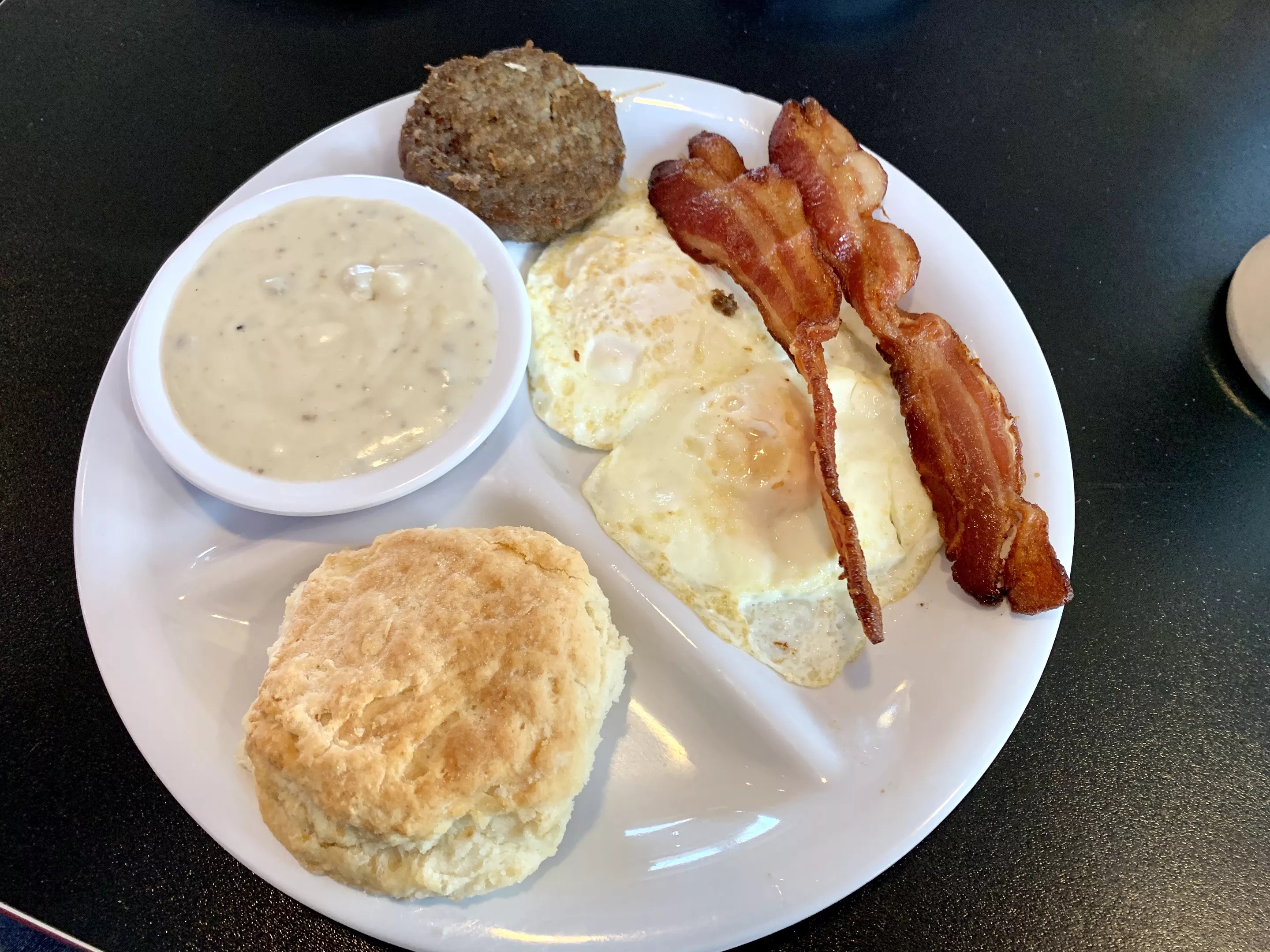 Better yet, breakfast here is on the less expensive side: A plate of two eggs, bacon, sausage, a biscuit, gravy and a muffin was $6.29 and enough to share between two people.