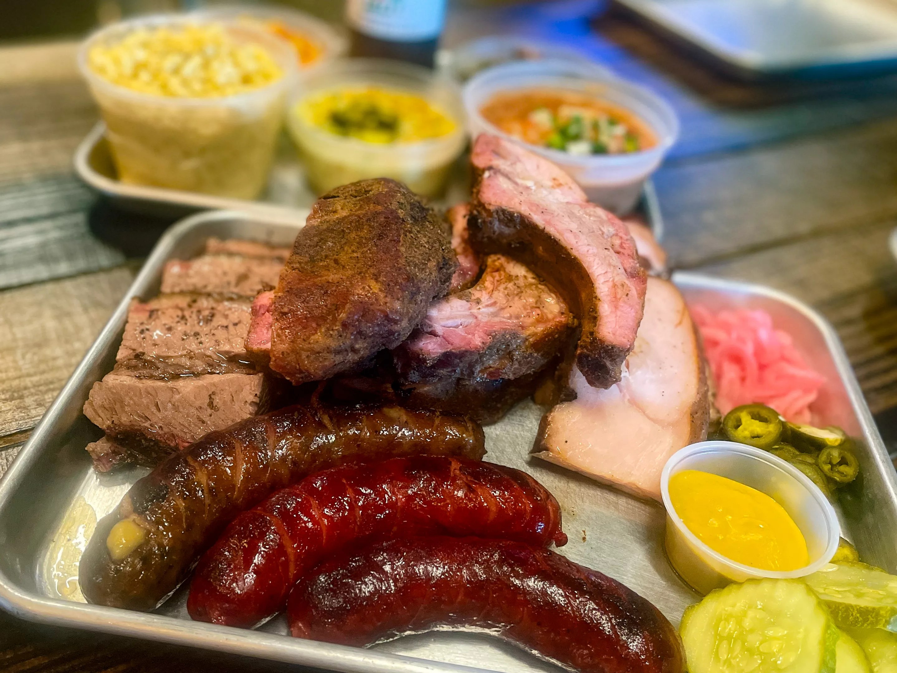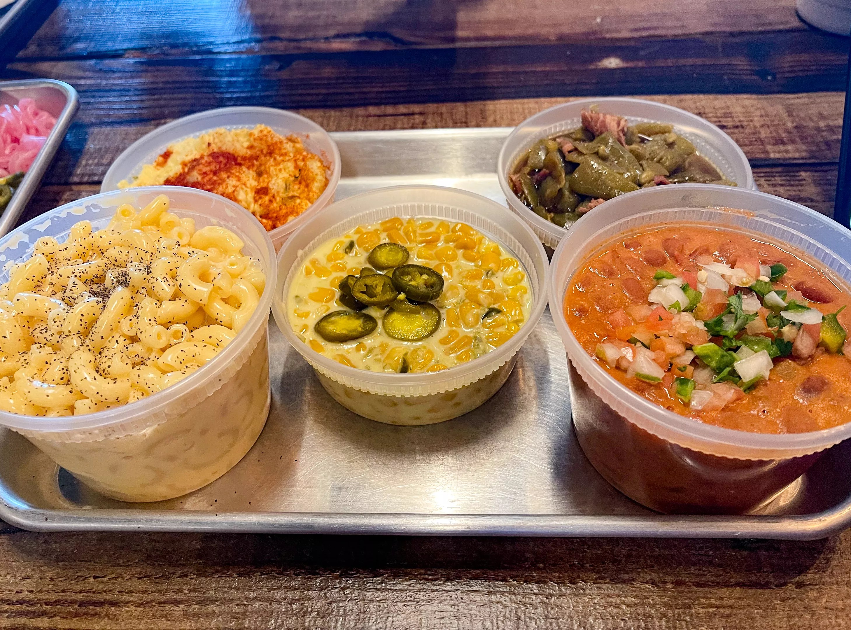 Our first look required some strategic planning as there were so many things we wanted to try. In round one we tackled the brisket nachos ($17), piled high with moist chunks of smoked brisket, Threeso (three-cheese queso), pickled jalapeños, pickled onions and pico. The nachos are served on the same size tray used to serve the barbecue. It’s easily shareable between two people or could be a full meal (or two). Be sure to douse the nachos with the homemade jalapeño barbecue sauce, which was the icing on the chip for us.