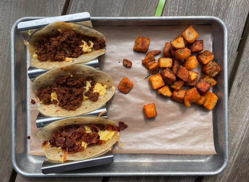 Next were the breakfast tacos. There are three choices of filling, and though we know the Community kitchen does great with vegetarian options like the Nashville Hot Dang, we went with all meat this round in the form of bacon and chorizo. Pickled jalapenos and house-made salsa were great additions, though the tacos stood out on their own without any extra condiments.