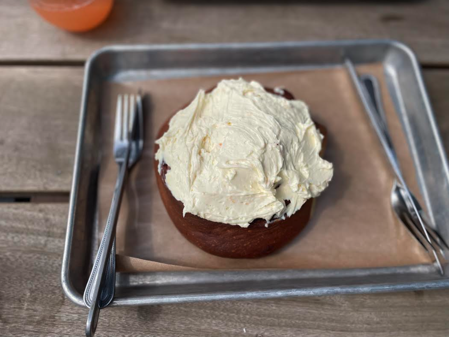 The giant cinnamon roll ($12) allowed us to finish off our meal with a sweet bite while we enjoyed the sunshine. The word giant doesn’t begin to cover the size of this thing, but if we weren’t already full we probably still would have crushed this. They make the dough from scratch and Chef Jenn Dahlen says this pastry is inspired by both her grandmother’s cinnamon bread and orange rolls that were holiday favorites.