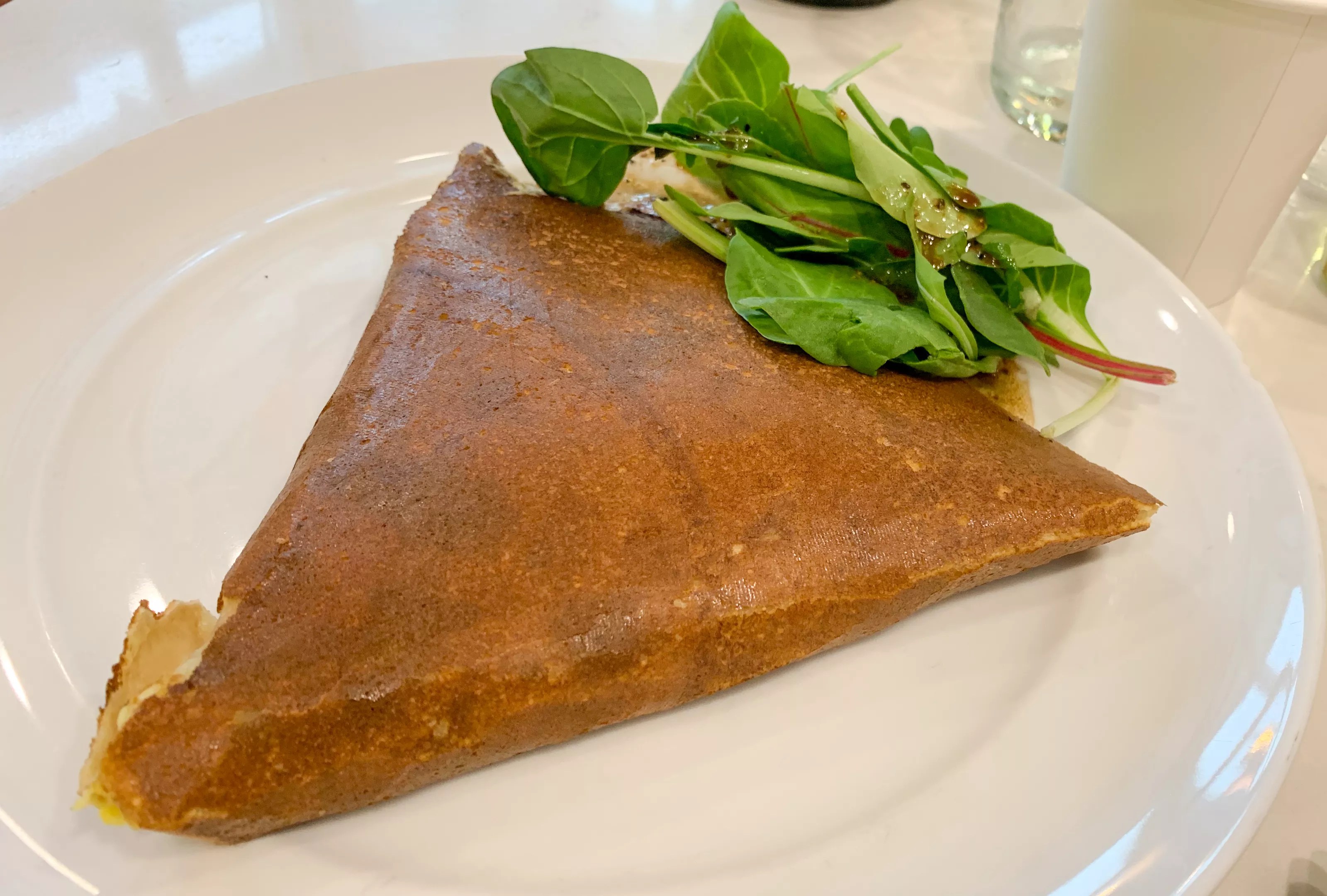 The French ham is chock-full with all the ingredients: The egg could’ve used some salt and pepper, but the ham does come in with a proper hit of salt. The creme fraiche smooths the whole experience, and the chives brighten up the flavor. The salad on the side actually has a delightful vinaigrette that had me forking spinach onto a crêpe – a first for me, anyway.