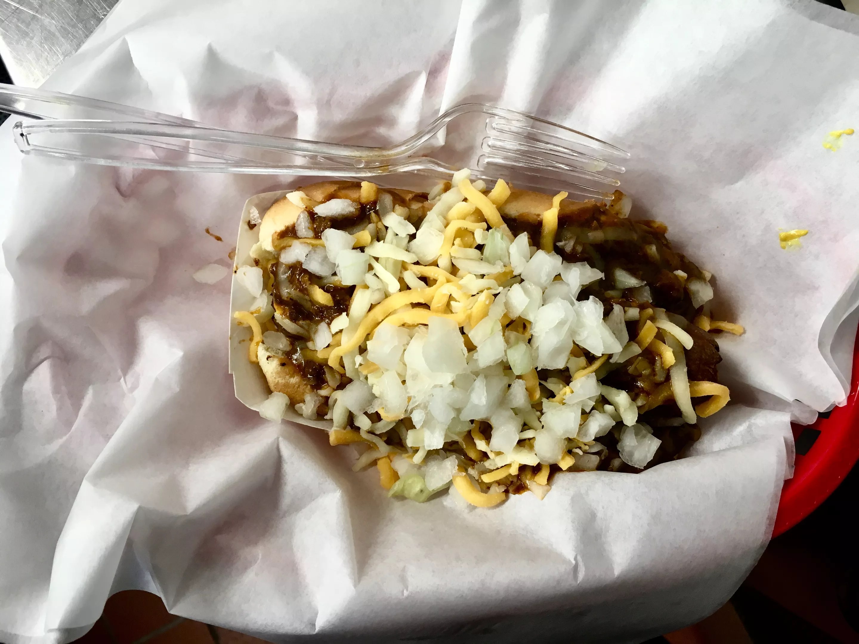 “No seats back there,” an older patron in red suspenders and a matching red hat says, taking his time to sit at the counter with his basket. He’s the only one taking a beat in the hustle of things. I’m certainly having trouble taking my time: A chili cheese dog has just been handed over, plastic fork and knife laid in the basket like mining tools.