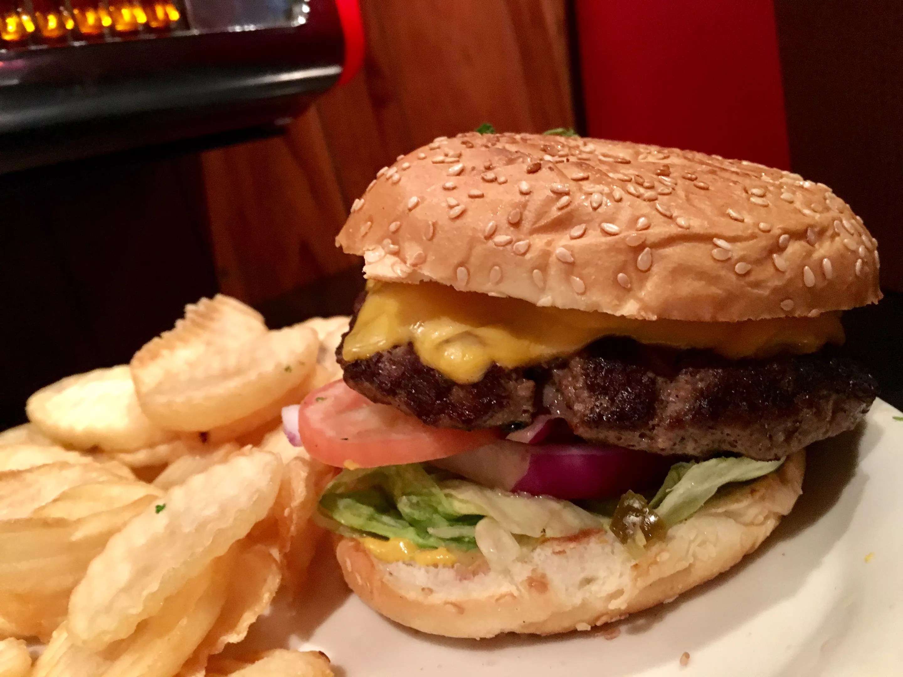 My beef patty is cooked medium rare, and the dressed lettuce adds a pop. The tomatoes are rough: They’re under-ripe and nearly tough. The construction – beef patty balanced over thick onion, two tomato slices and a pile of jalapeños – allows for some sandwich slippage. My fries, crinkle-cut circles, needed to crisp for longer. Still, the beef juices roll into the onion and dill pickle slices, and it tastes like a satisfying, greasy spoon burger that you’ll remember.