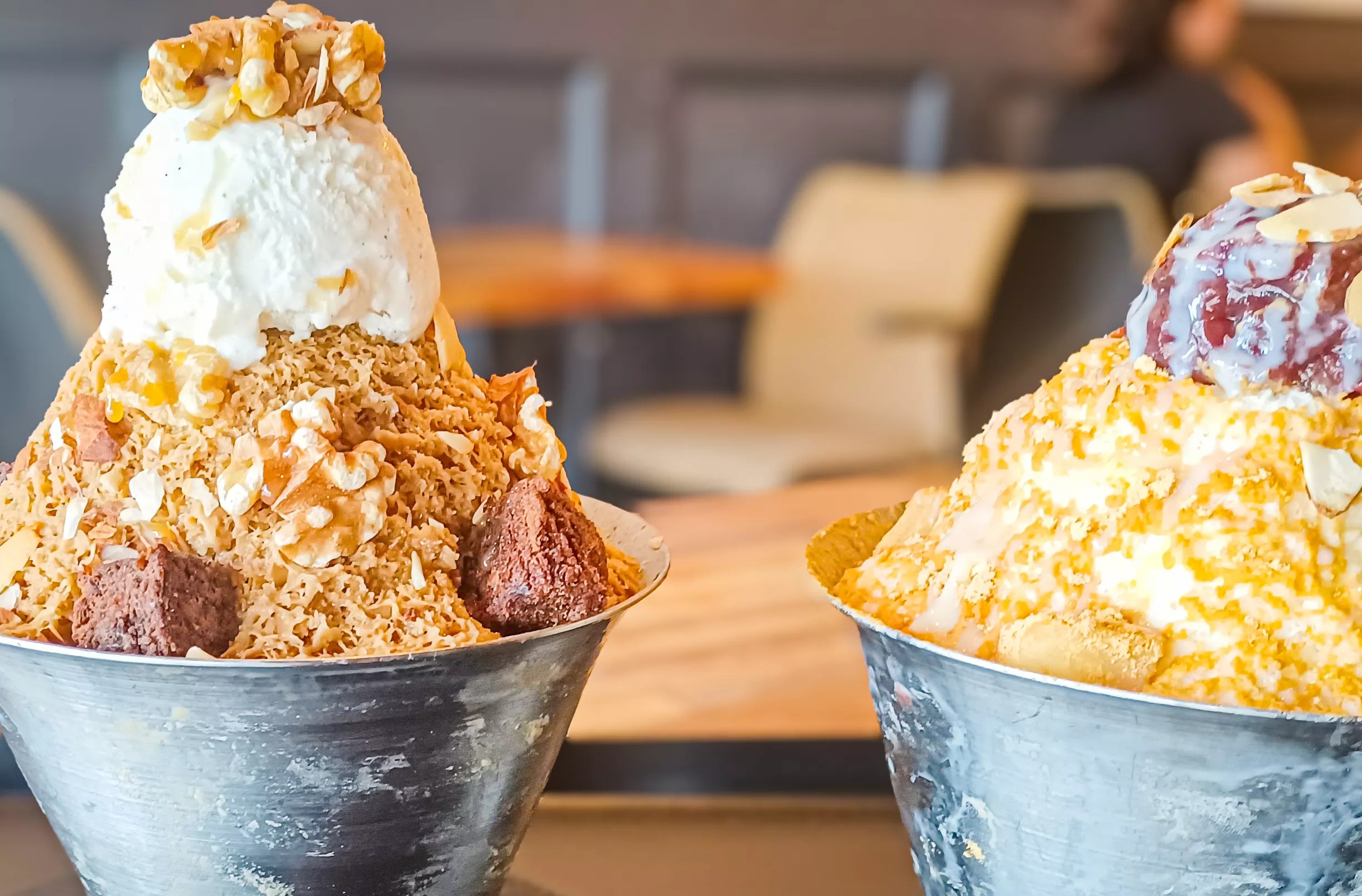 Traditional snow cones are usually made with crushed ice chips from water, but these desserts are technically bingsu, a popular Korean take on shaved ice. Bingsu are made with a milk-based ice that is finely milled to resemble snow powder.